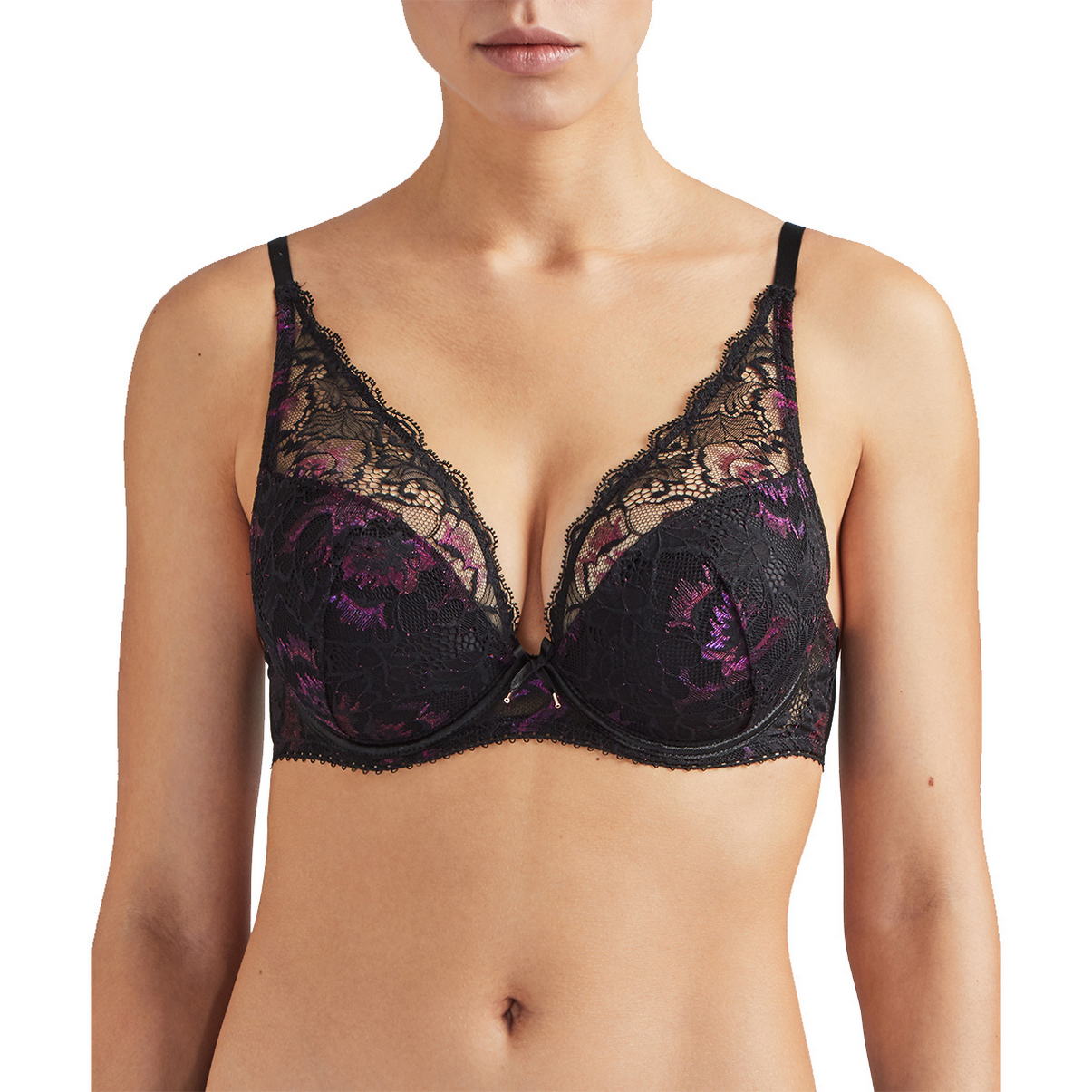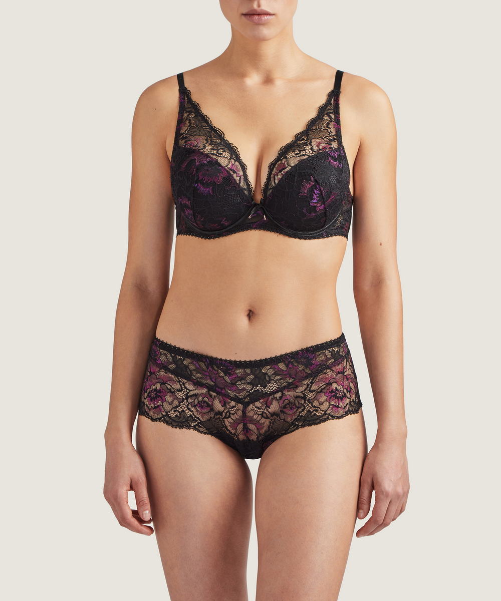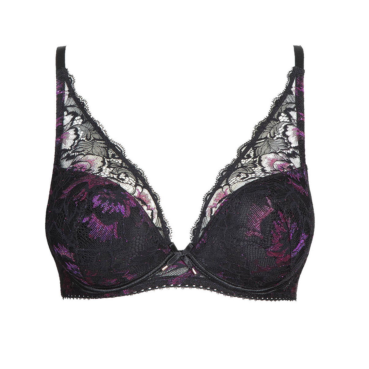 Бюстгальтер - пуш ап з ущільненою формою чашок із прошарком із мусу для надання візуально додаткового об'єму. Чашки вкриті триколірним мереживом, яке плавно перетікає в бретелі. Зона декольте доповнена декоративними зубчиками, на центральній панелі – атласний бантик. Регульовані бретелі.