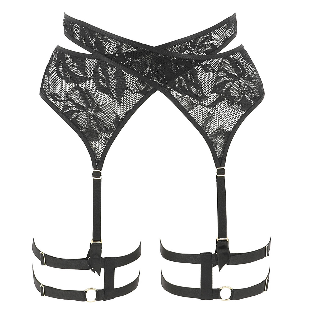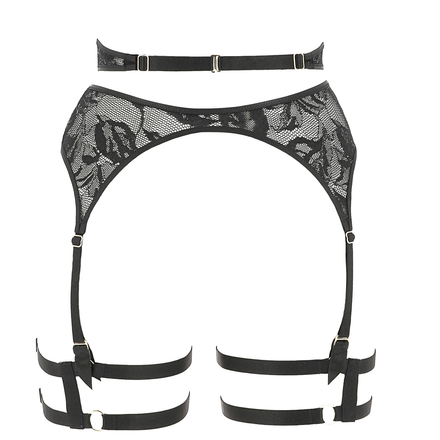 Пояс для панчох з чотирма підтяжками, що регулюються. Повністю виконаний із жаккардового мережива з квітковим орнаментом, який доповнений люрексовою ниткою. Застібка - ззаду на гачку - на атласній смужці, що регулюється, за допомогою якої можна регулювати розмір.