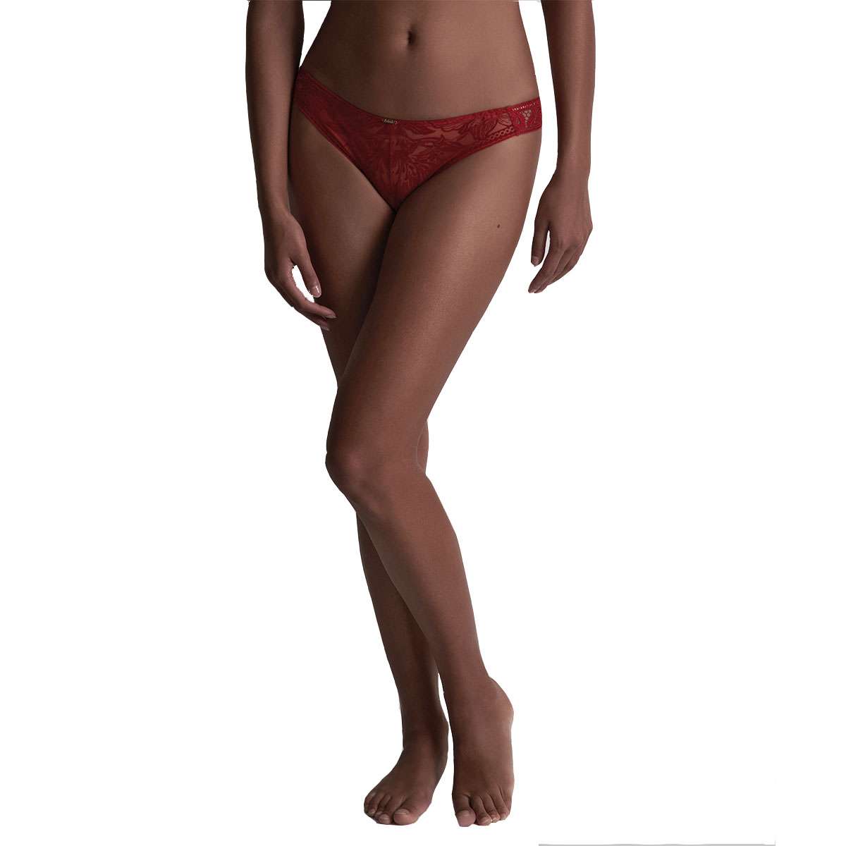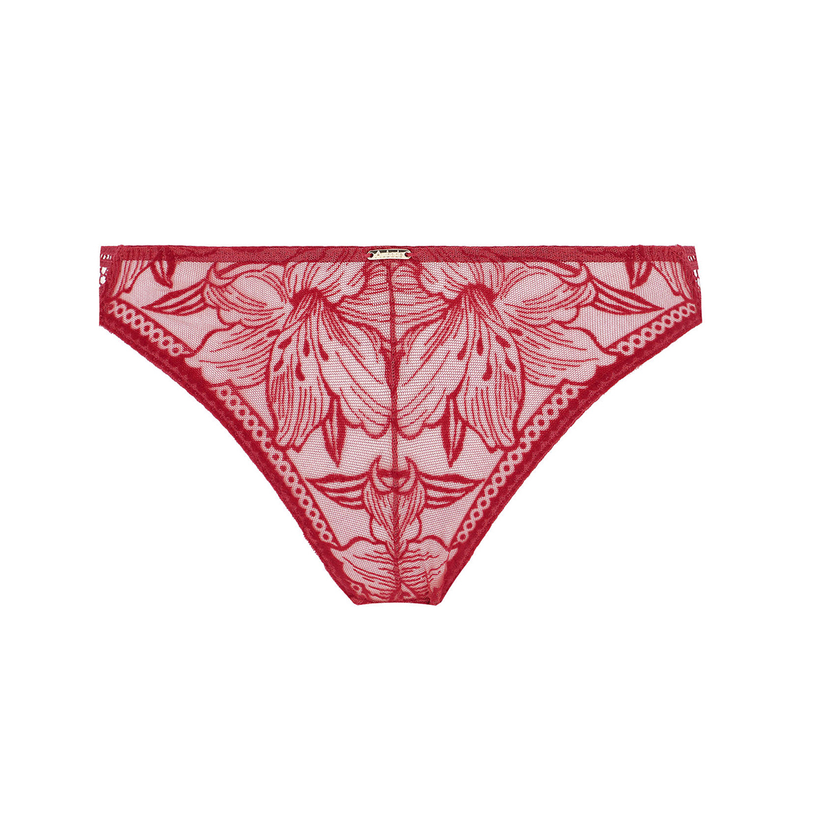 Труси – стрінги із середньо – заниженою посадкою. Практично повністю виконані з тюлю з вишивкою з оксамитовим напиленням. З боків – вставки з гіпюру. На передній панелі розмістився металевий аксесуар із логотипом. На задній панелі - декоративна "крапелька". Необроблені краї на задній панелі.
