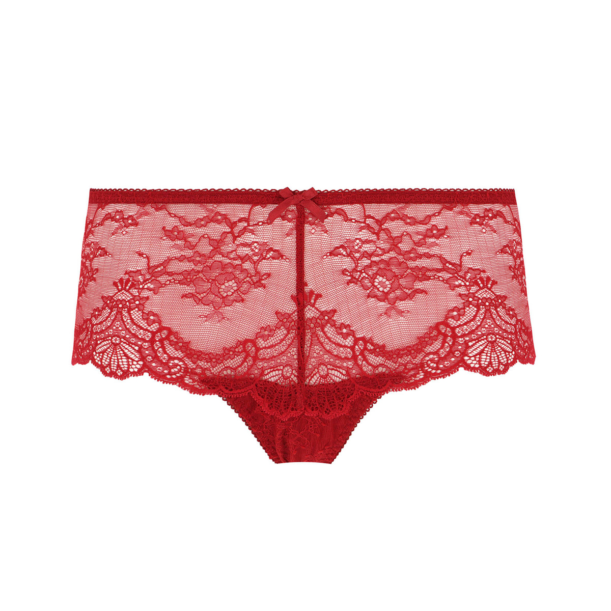 Труси-боксери із середньо-заниженою посадкою повністю виготовлені з мережива з квітковим орнаментом. Верхній край доповнений декоративними зубчиками. На передній та задній панелях розмістився делікатний бантик.