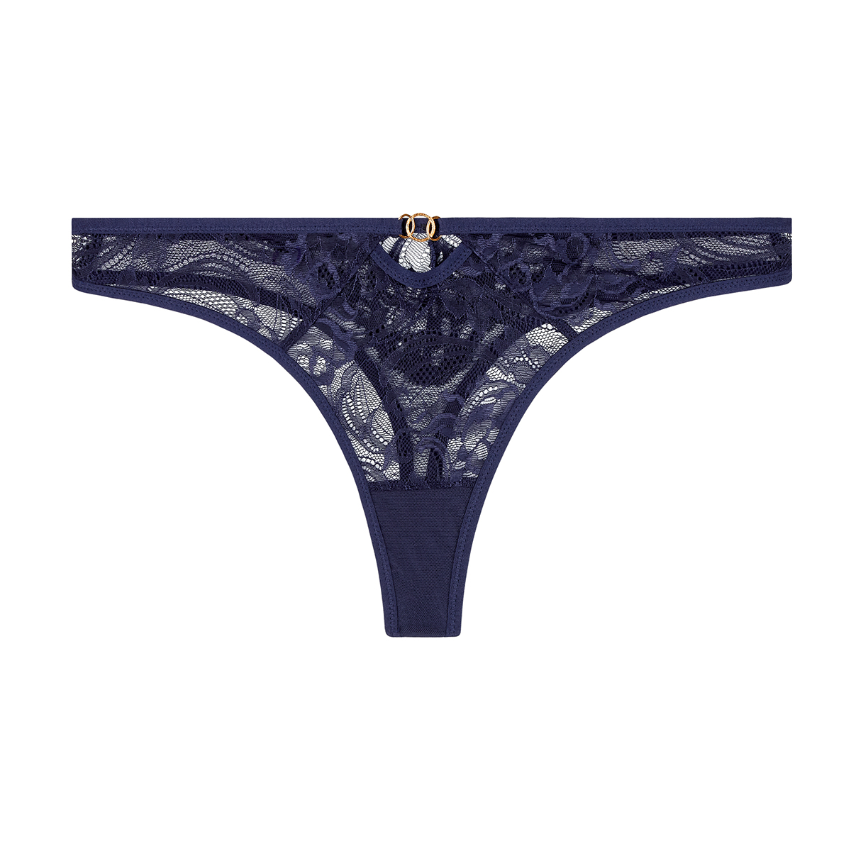 Труси - стрінги з тюлю з елегантним французьким мереживом. Оздоблені золотими кільцями із замаку на передній панелі.