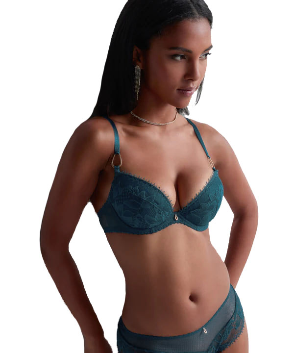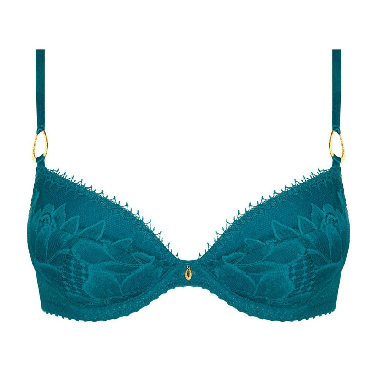 Бюстгальтер-пуш-ап на кісточках, чашки із подушечками, що знімаються, які візуально піднімають груди і створюють об'ємний спокусливий силует. Виконаний із вишуканого французького мережива Leavers із витонченим орнаментом лотоса. Між чашок модель прикрашена золотим ексклюзивним елементом із замаку. Тонкі фіксовані регульовані бретелі в основі декоровані витонченими золотими кільцями. На задній панелі передбачено застібку.