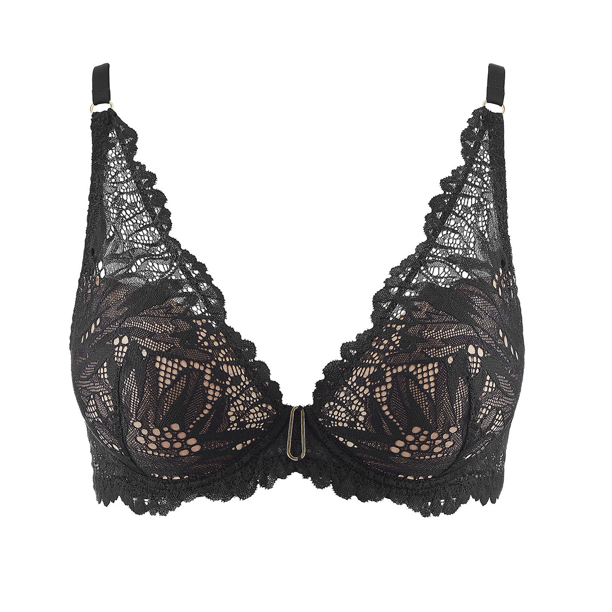 Бюстгальтер - пуш ап c ущільненою формою чашок із прошарком із мусу; на кісточках. Чашки з мусу бежевого кольору, покриті чорним розкішним мереживом з екзотичним квітковим орнаментом. Центральна панель доповнена металевим аксесуаром. Задні панелі дубльовані. Регульовані бретелі