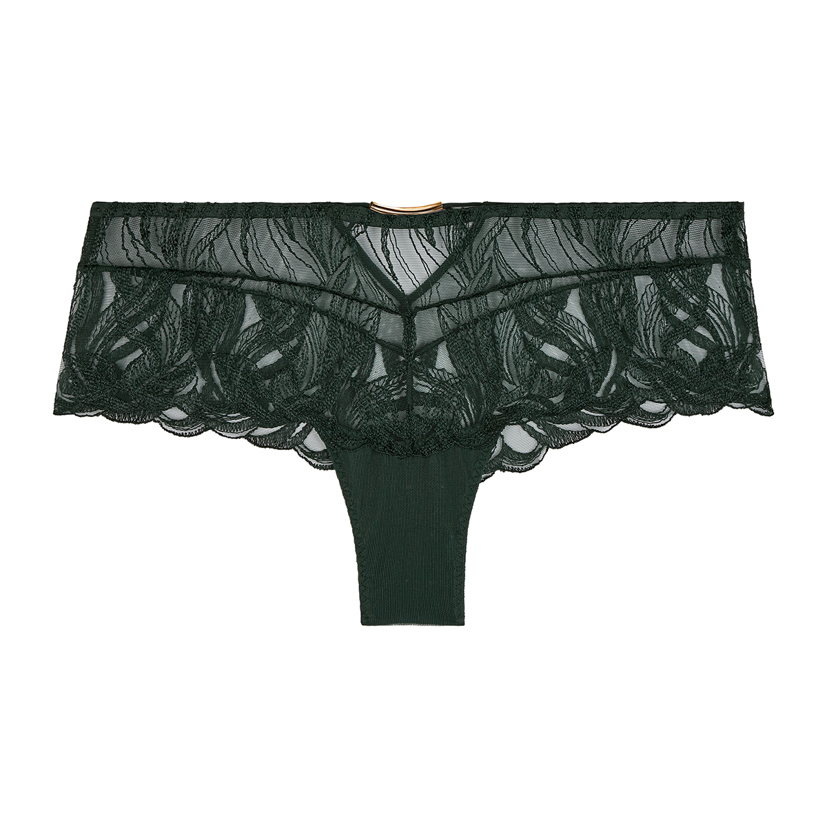 Труси-боксери із заниженою посадкою виконані з тюлю. Модель прикрашає розкішна вишивка з графічним плетеним мотивом та прикраса із золотого замаку на задній панелі.