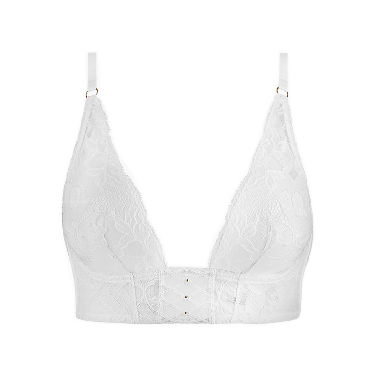 Бюстгальтер-бралет із трикутною формою чашок, без кісточок, оснащений широкою еластичною гумкою під грудьми для комфортної посадки. Виконаний із прозорого тюлю, прикрашеного витонченим мереживом із квітковим орнаментом. Модель має глибоке V-подібне декольте, доповнене декоративною переплетеною вишивкою між чашками. Тонкі еластичні бретелі можна поєднувати на спинці, створюючи ефект стильного переплетення.