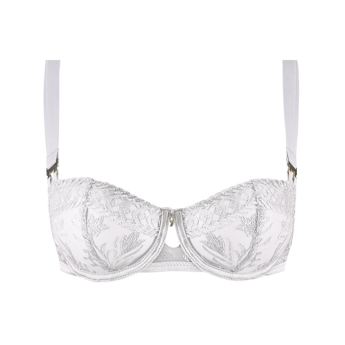 Бюстгальтер – балконет з м'якою досить відкритою формою чашок на кісточках. Чашки виконані з розшитого квітковою вишивкою тюля. На центральній панелі розмістилася золота деталь. Широкі бретелі-спагетті біля основи також доповнені золотою декоративною деталлю. Для великих розмірів - чашки дубльовані тюлем для додаткової підтримки; широка балетна спинка – для збалансованого розподілу навантаження.