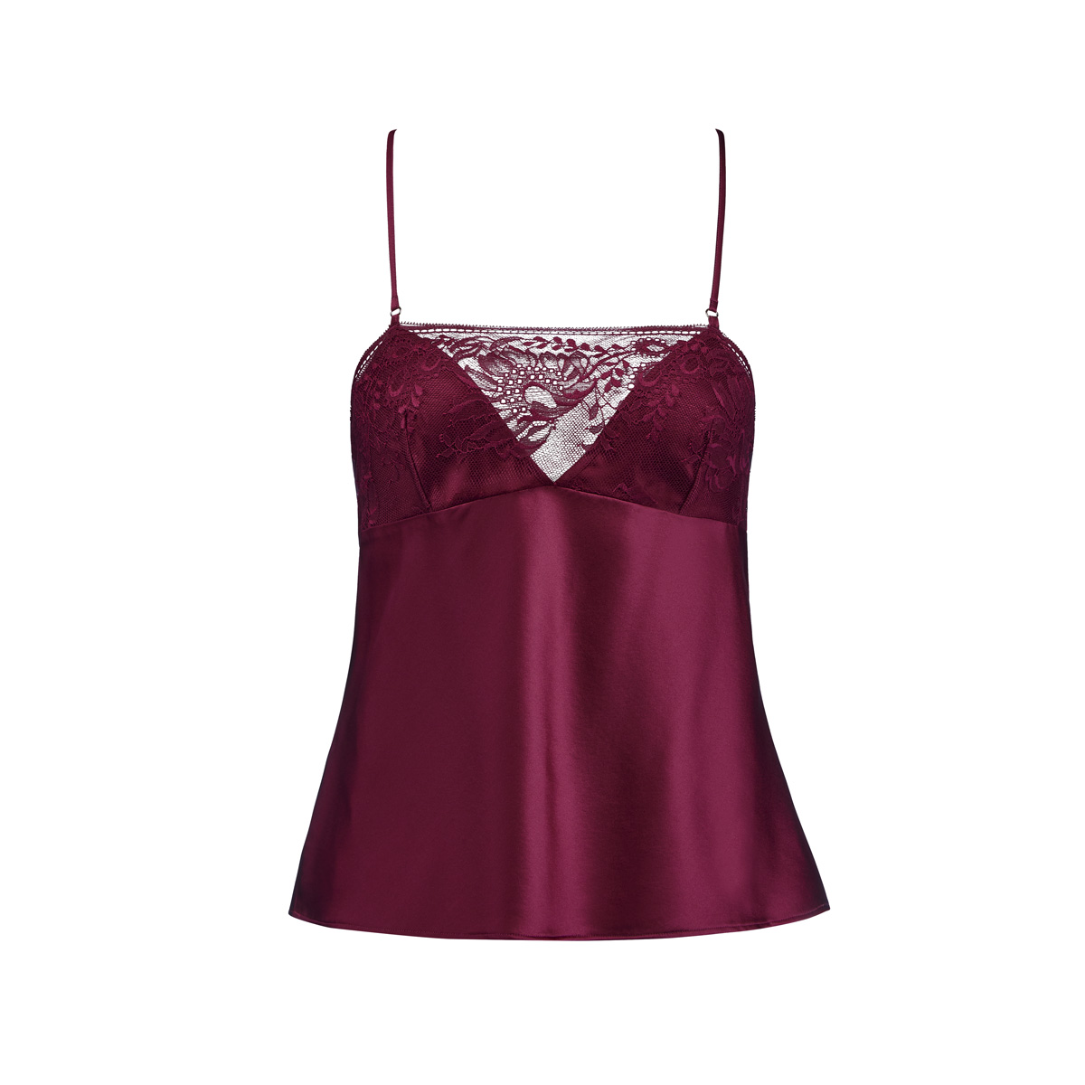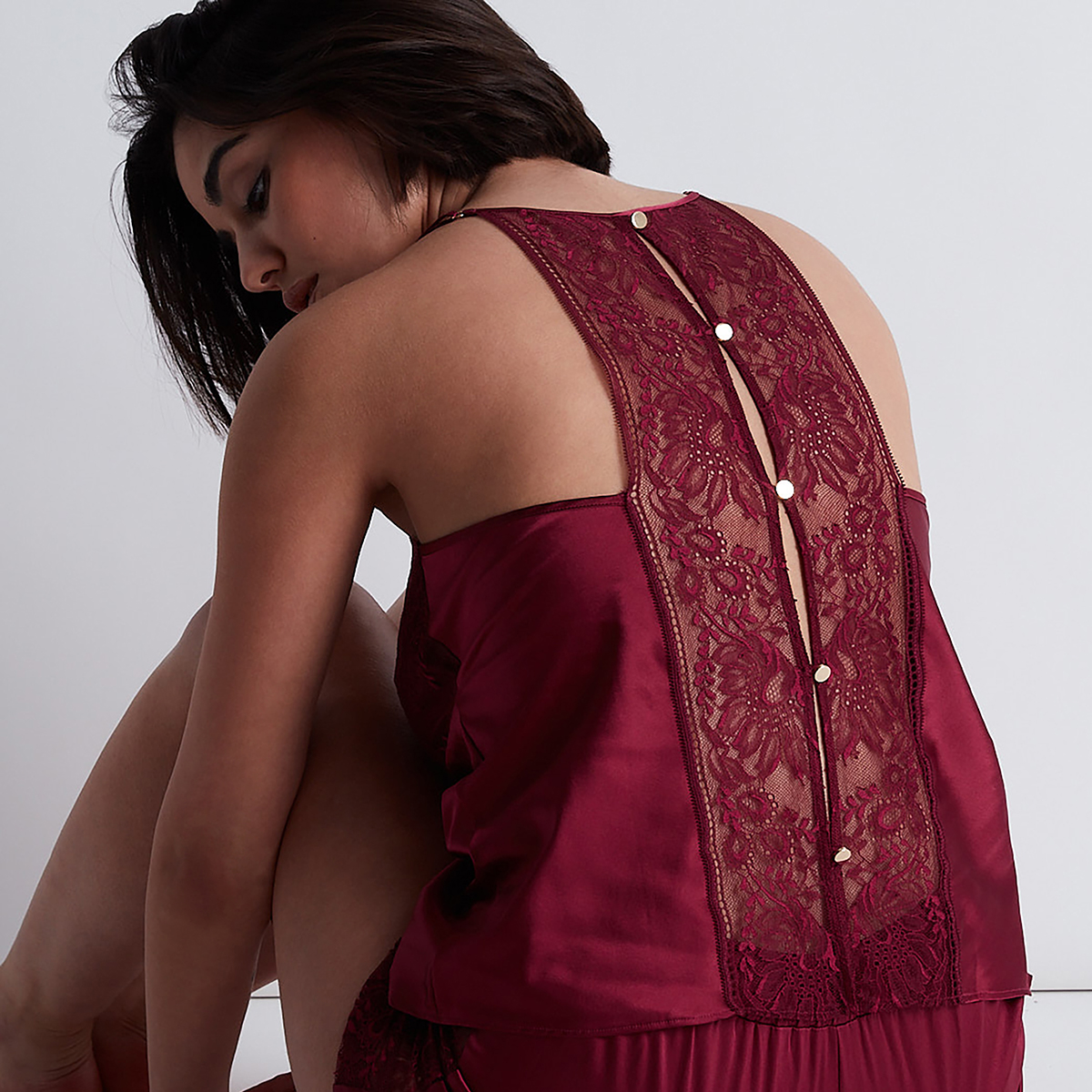 Майка вільного крою з V-подібним вирізом, з м'якою трикутною формою чашок без кісточок. Чашки покриті мереживом. Оригінальна форма задньої панелі, виготовленої з мережива і доповненої золотистими декоративними гудзиками. Тонкі регульовані бретелі. Виконана з еластичного шовку.
