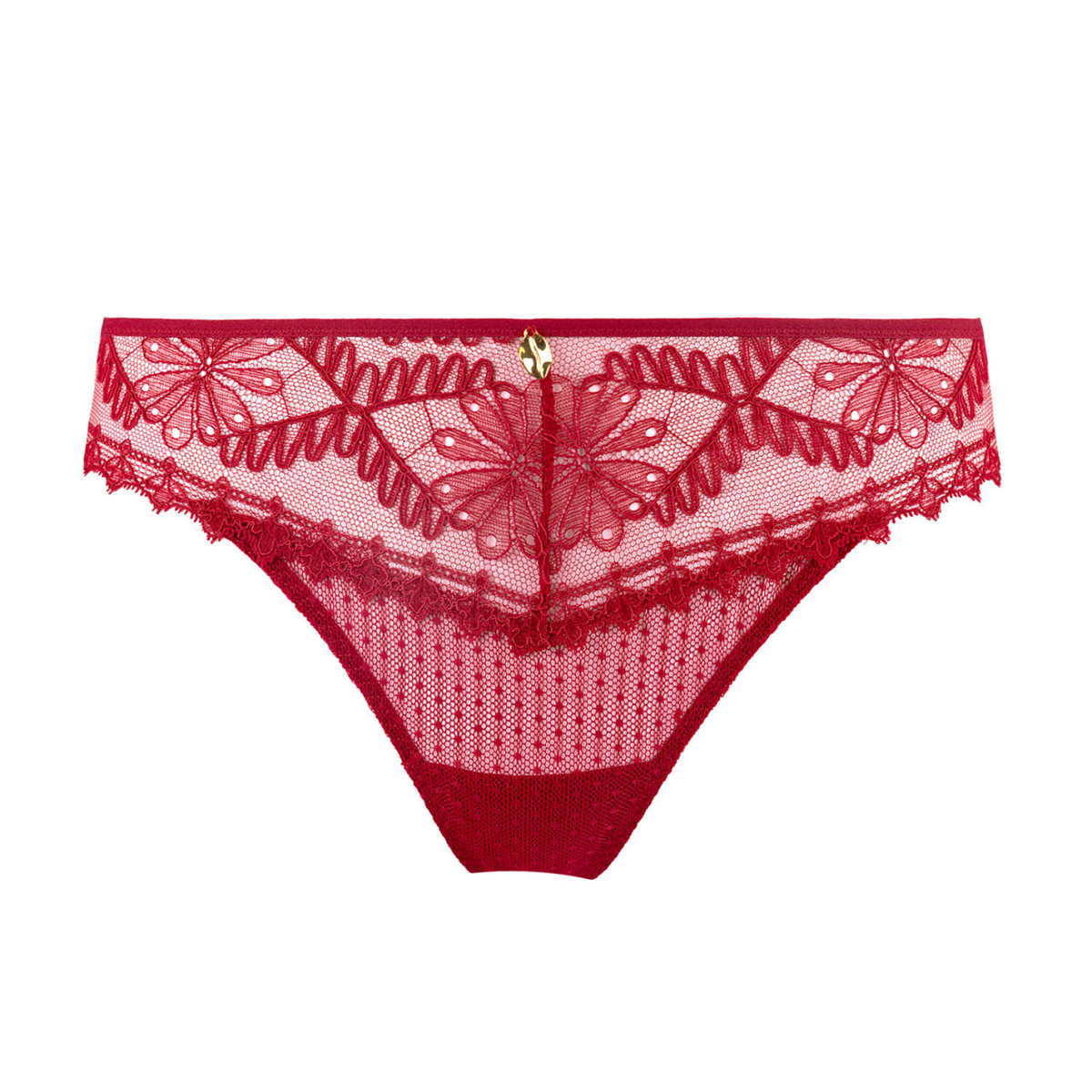 Труси-стрінги із середньо-заниженою посадкою, виконані з витонченого квіткового мережива. Передня панель прикрашена фірмовим позолоченим елементом, задня – акуратним вирізом із позолоченою деталлю.