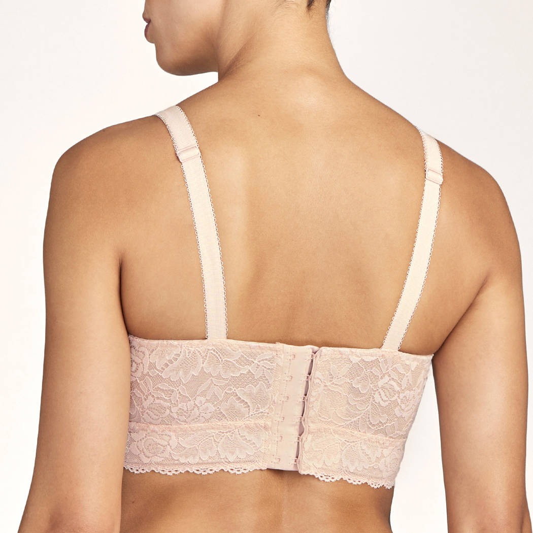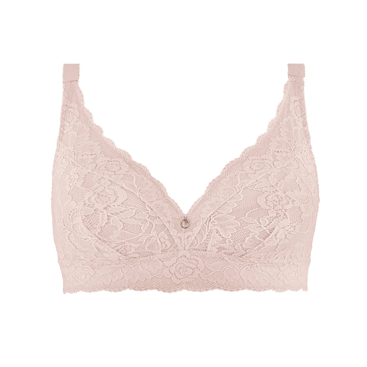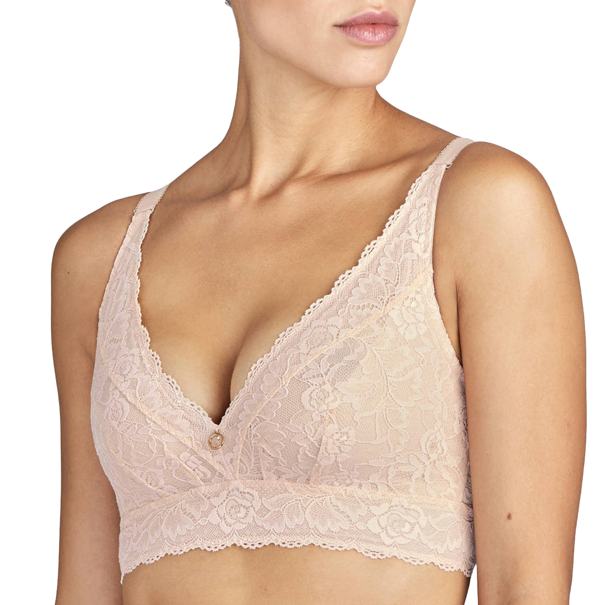 Бюстгальтер - бралет з м'якою трикутною формою чашок, без кісточок. Чашки виготовлені з мережива з квітковим орнаментом і з внутрішньої сторони дубльовані тюлем для надання необхідної підтримки. Область декольте доповнена декоративними зубчиками. На центральній панелі розмістилося маленьке "золоте" колечко зі стразою від "Swarovski". Основа бюстгальтера - мереживна тасьма. Дуже широкі бічні панелі і бретелі, що регулюються.