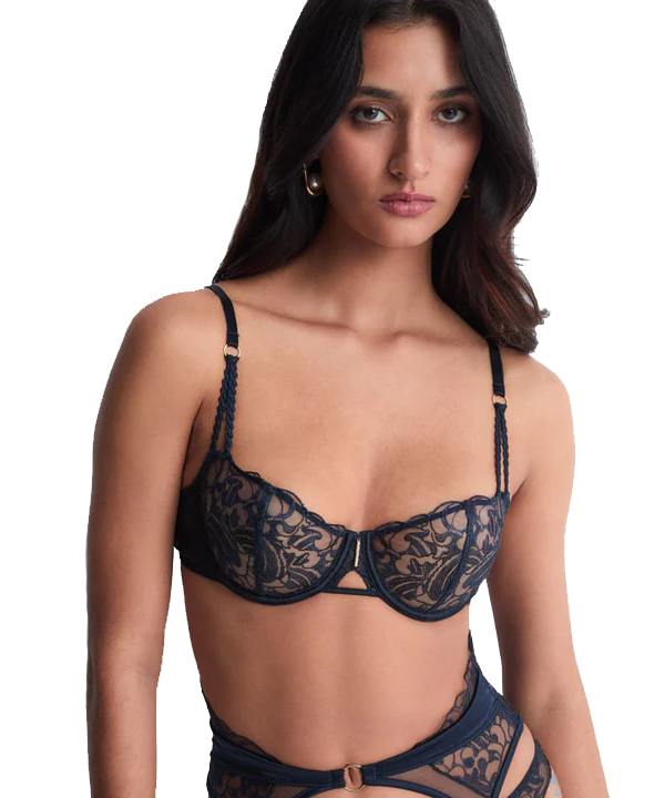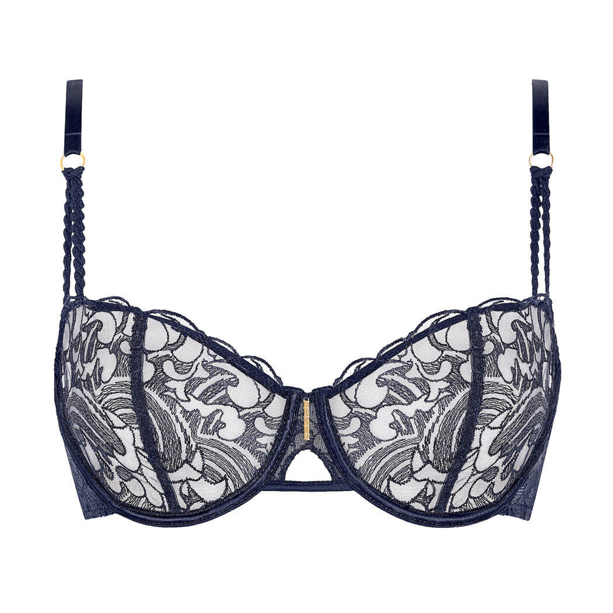 Бюстгальтер-балконет на кісточках з м'якими чашками поєднує ефектний дизайн та комфорт. Передня панель виконана з прозорого тюлю з розкішною вишивкою, а задня — з гладкого атласу. Невеликий виріз та декоративний позолочений елемент між чашками додають моделі вишуканий акцент. Основи фіксованих регульованих бретелів прикрашені подвійними плетеними кісками, а застібка на задній панелі забезпечує надійну та акуратну посадку.