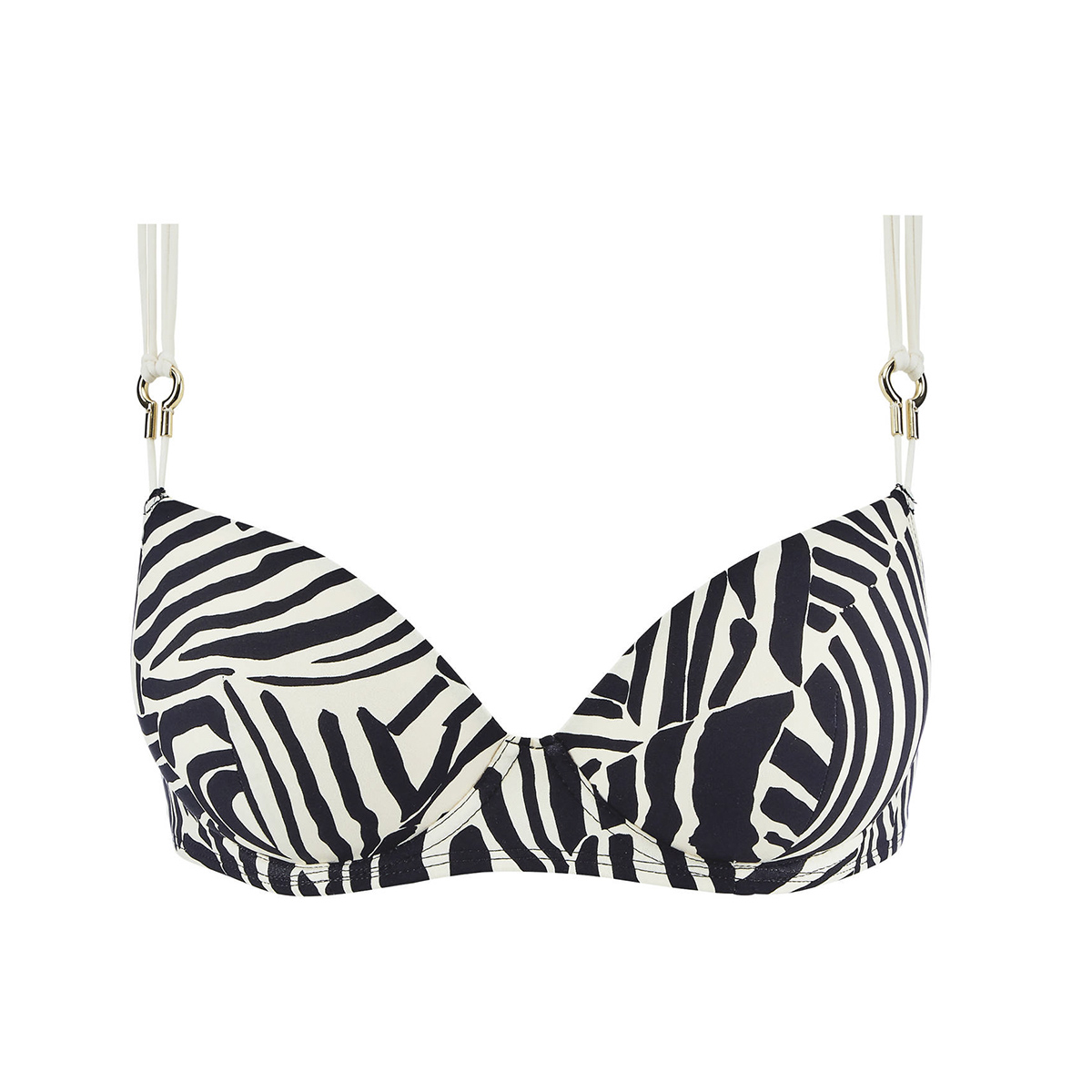 Бюстгальтер – пуш ап із ущільненою формою чашок із прошарком із мусу на кісточках. Чашки покриті м'якою, еластичною та гладкою мікрофіброю з набивним малюнком. Еластичні бретелі-«спагетті», що регулюються та з'єднуються з чашками за допомогою золотих деталей. Застібка – золота кліпса з логотипом.