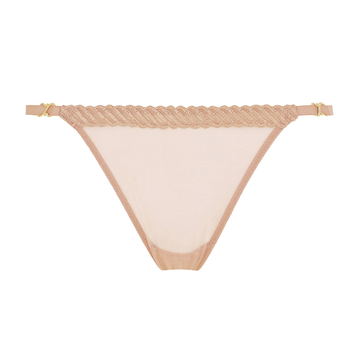 Труси-бікіні із середньо-заниженою посадкою, виконані із прозорого переробленого тюлю та прикрашені по краях вишуканою атласною вишивкою. Модель відрізняється максимально відкритими бічними панелями на еластичних бретелях, доповнених позолоченими декоративними елементами із замаку, що надають образу чуттєвості та витонченості.