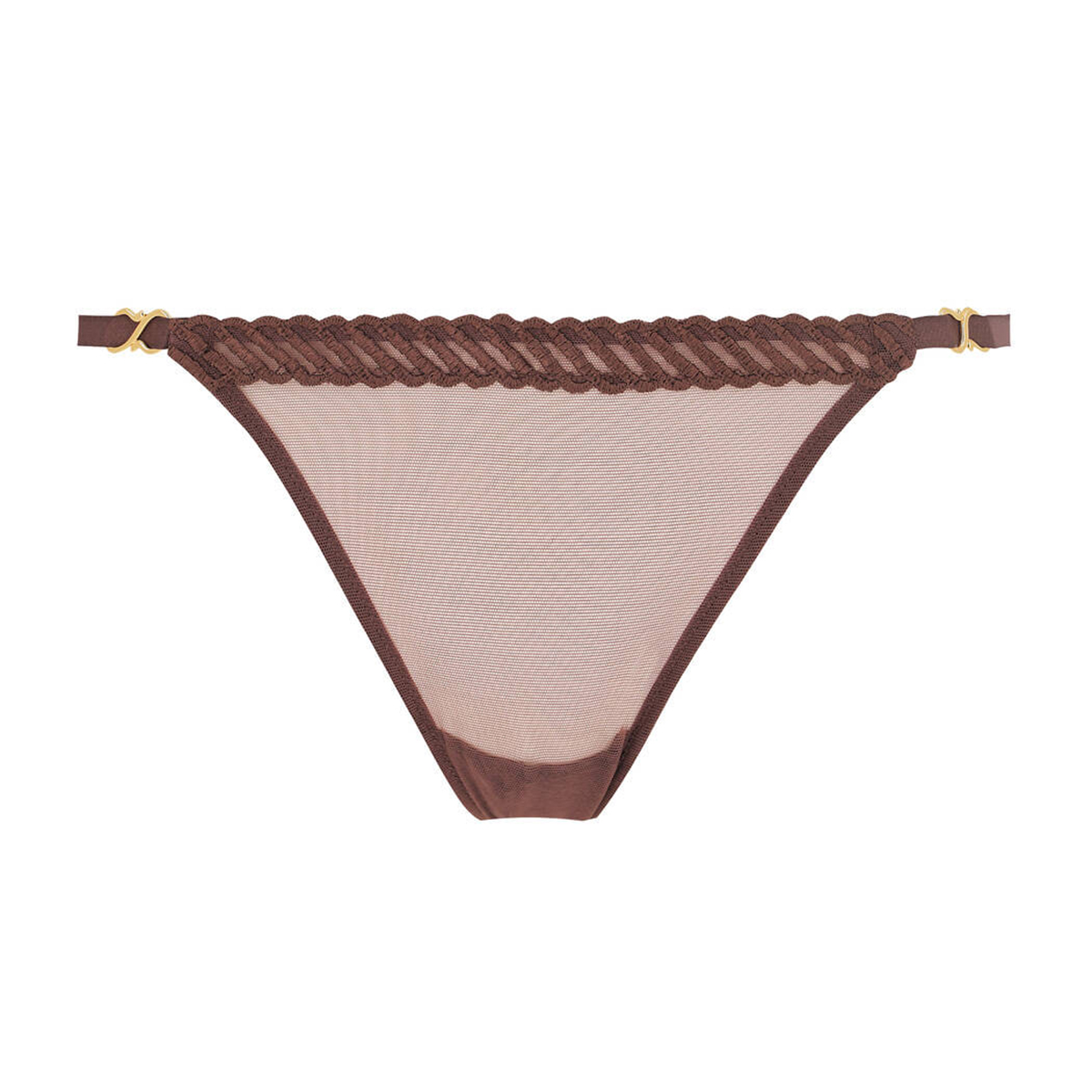 Труси-бікіні із середньо-заниженою посадкою, виконані із прозорого переробленого тюлю та прикрашені по краях вишуканою атласною вишивкою. Модель відрізняється максимально відкритими бічними панелями на еластичних бретелях, доповнених позолоченими декоративними елементами із замаку, що надають образу чуттєвості та витонченості.