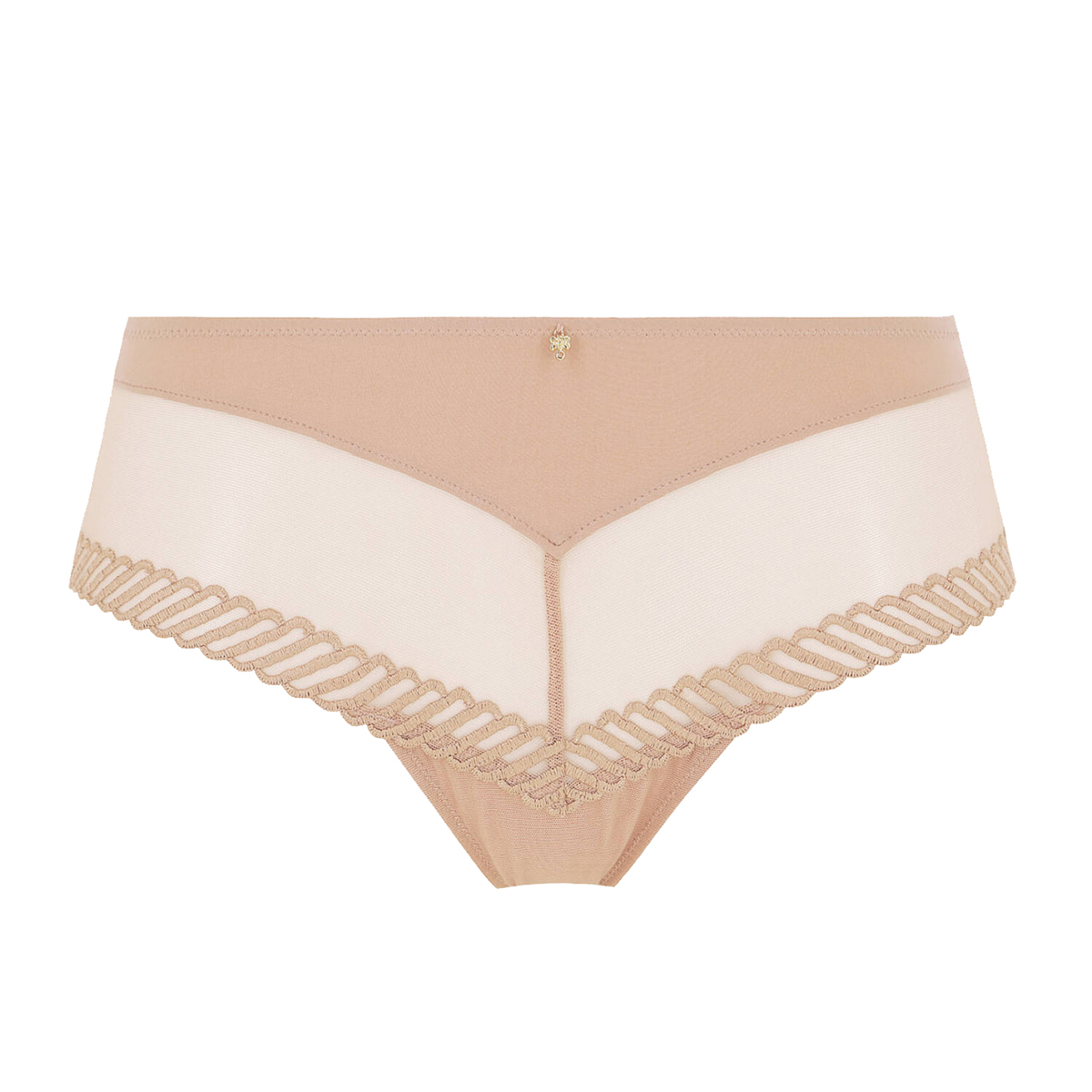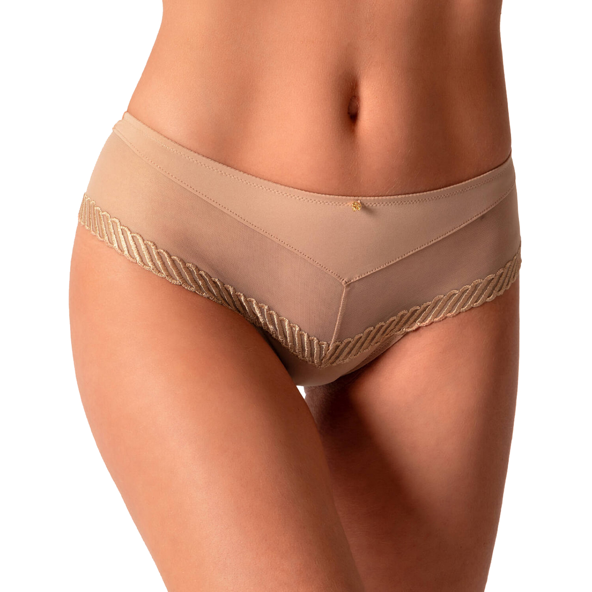 Труси-боксери із середньо-заниженою посадкою, виконані з м'якої ніжної мікрофібри зі вставками із переробленого тюлю. Нижній край моделі прикрашений витонченою атласною вишивкою, що надає образу ефектності. Центральна панель доповнена золотою прикрасою із замку.