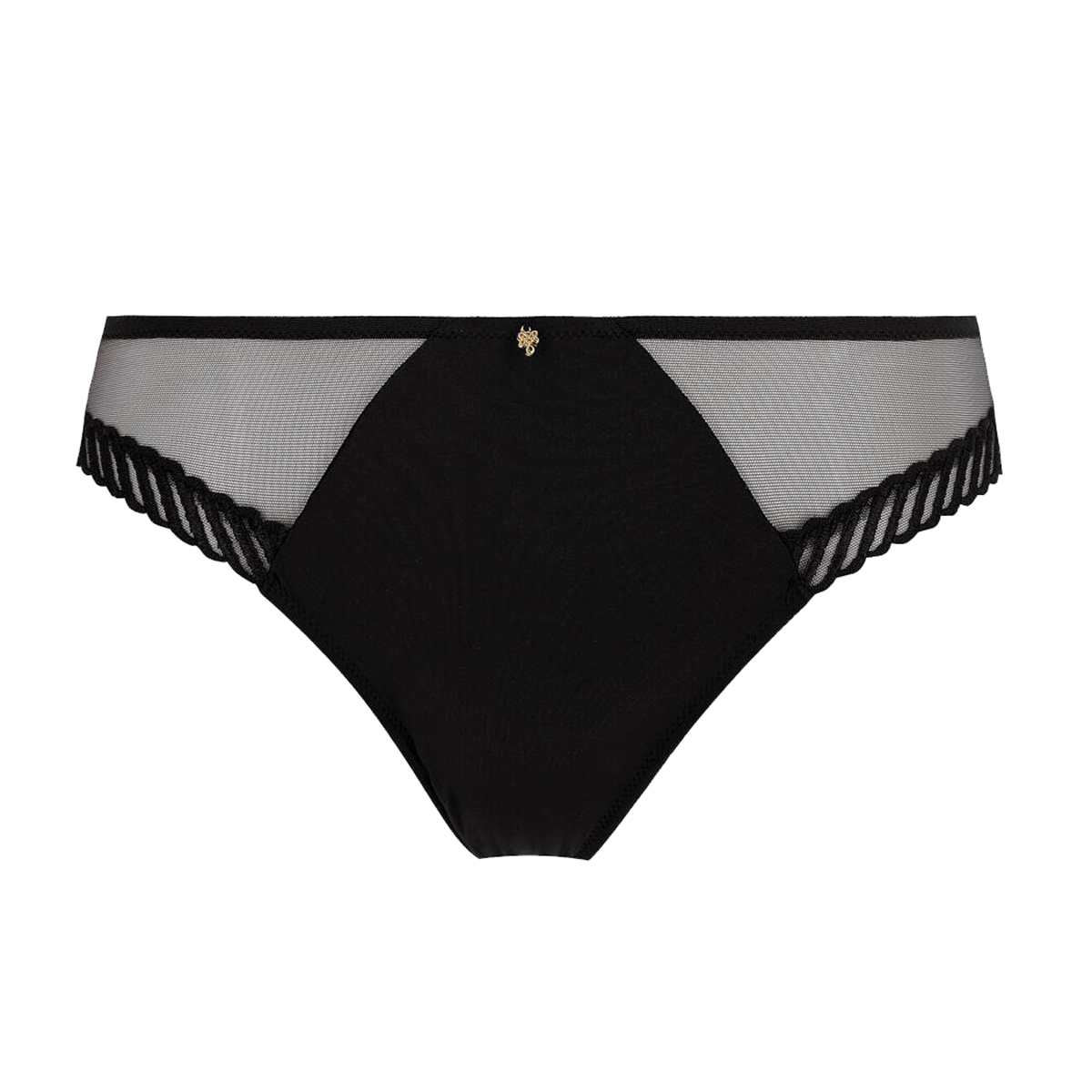 Класичні труси виконані з м'якої еластичної тканини з напівпрозорими вставками з тюлю, які надають моделі легкості та витонченості. Нижні краї прикрашені витонченою атласною вишивкою, а передня панель доповнена вишуканою позолоченою прикрасою із замаку, що робить акцент на елегантності та увазі до деталей.