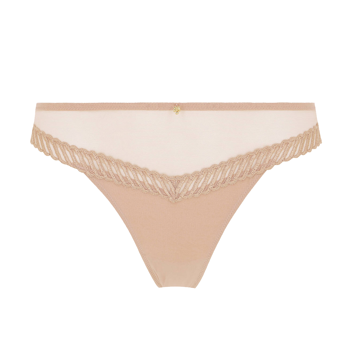 Труси-стрінги виконані з м'якої мікрофібри, що забезпечує комфорт та приємне прилягання до тіла, із вставками з переробленого тюлю, які додають витонченості та легкості. Атласна вишивка прикрашає модель, наголошуючи на її витонченості, а передня панель акцентована позолоченою прикрасою із замаку для нотки вишуканості.