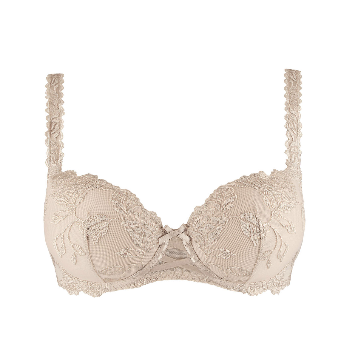 Нова форма від "Aubade" - ущільнений балконет. Бюстгальтер із ущільненою мульованою формою чашок. Гарантовано забезпечить необхідну підтримку та надасть Вашим грудям ще більш округлої форми. Чашки бюстгальтера вкриті тюлем із квітковою вишивкою. Регульовані бретелі, широка задня панель.