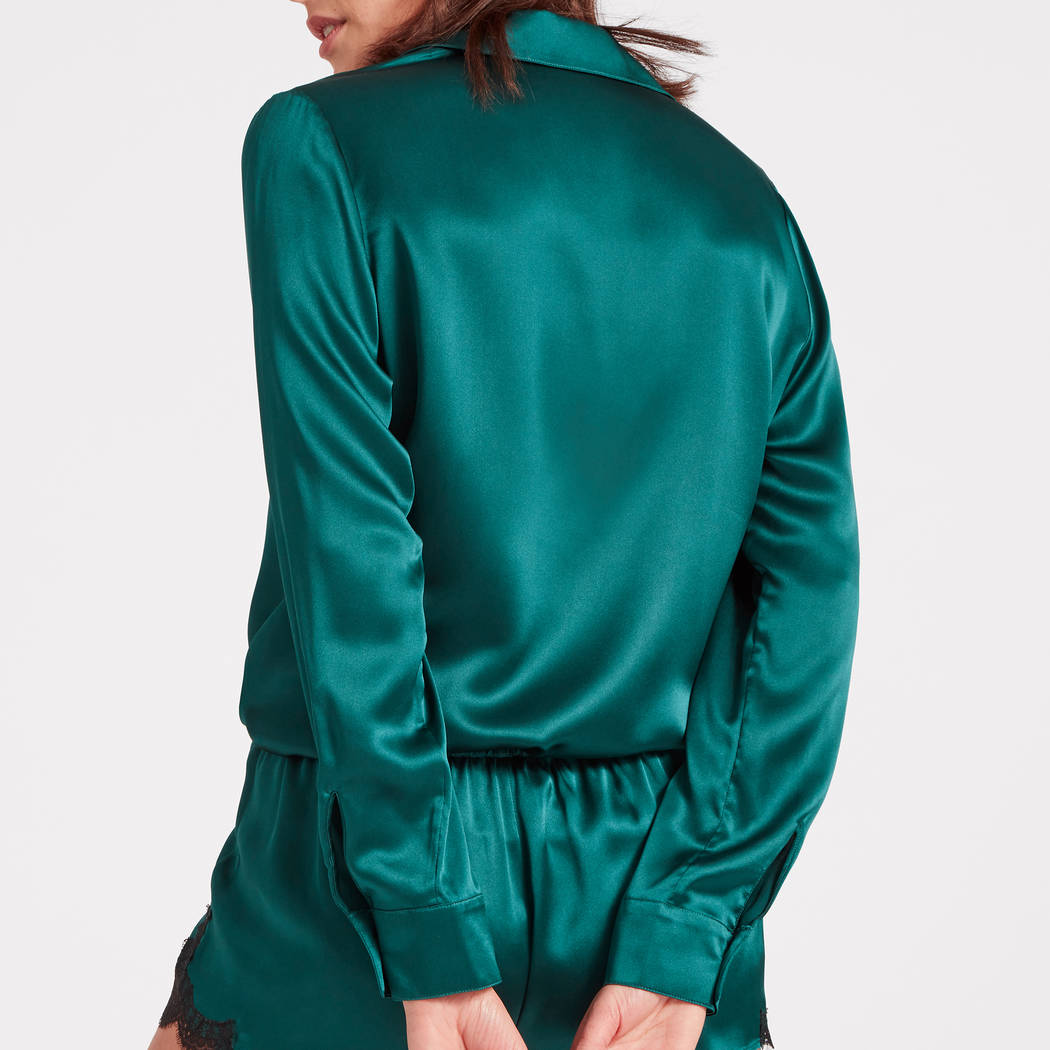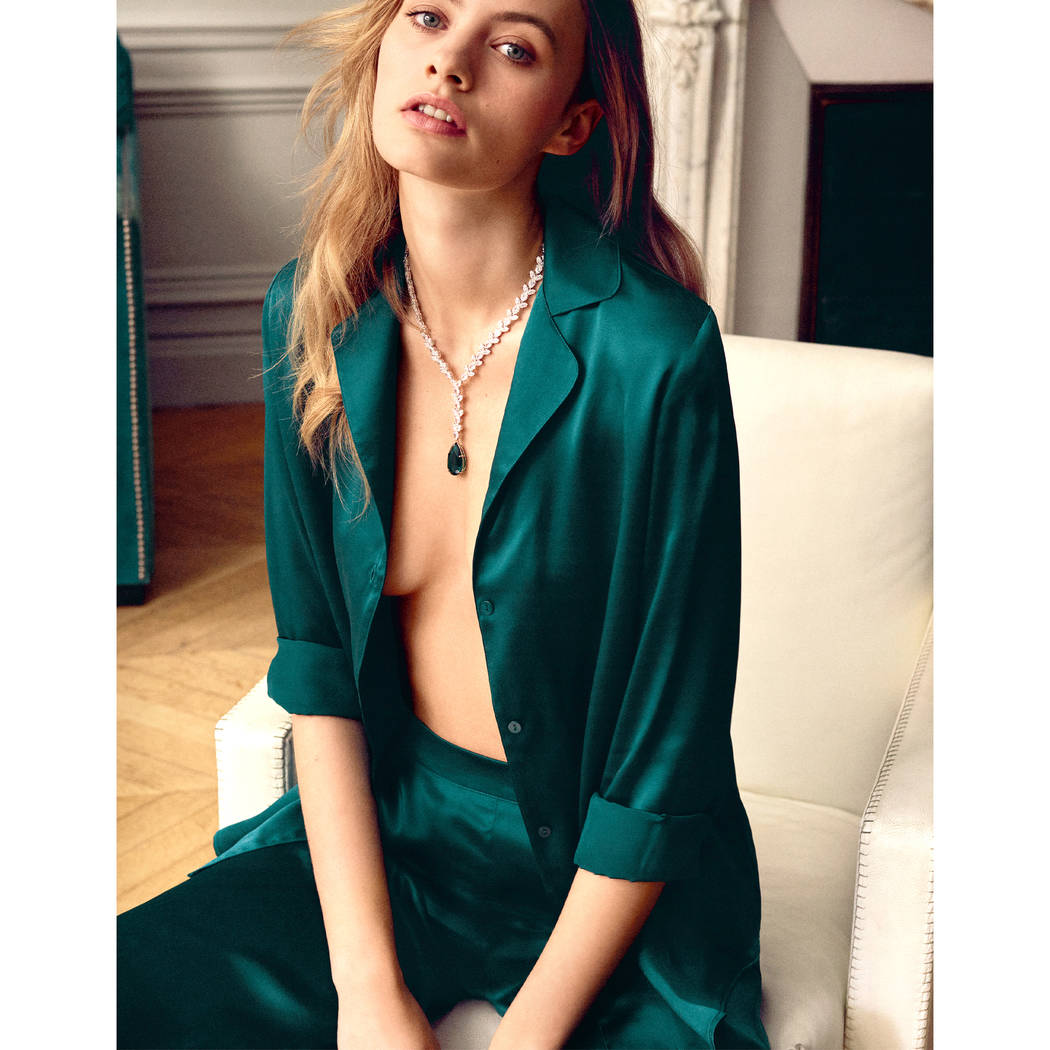Сорочка вільного крою на ґудзиках з довгими рукавами з V-вирізом та комірцем. Повністю виготовлена з шовку і потребує особливого догляду.