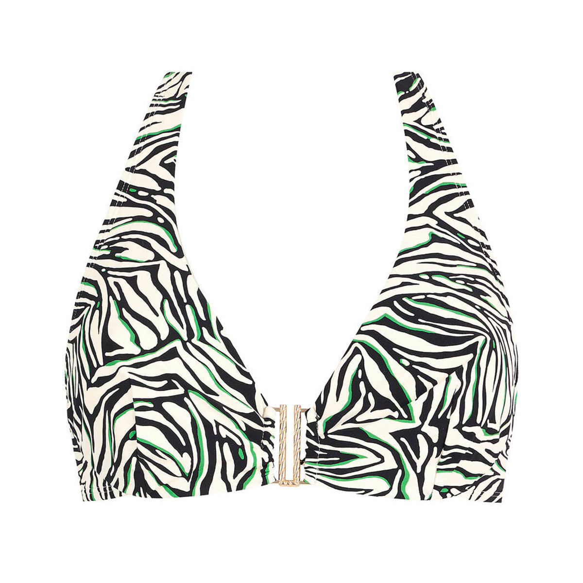 Бюстгальтер із м'якими трикутними чашками з додатковою підкладкою, на кісточках. Виконаний з ніжної еластичної тканини, що делікатно облягає силует. Глибоке V-подібне декольте прикрашене позолоченим фірмовим елементом між чашками, що створює вишуканий акцент. Широкі бретелі зав'язуються на шиї, а на спинці передбачено застібку для надійної та комфортної посадки.