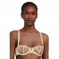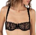 Бюстгальтер з трикутною напівущільненою чашкою на кісточках. Чашки виконані з мережива з рослинним орнаментом. Область декольте доповнена декоративними зубчиками та шнурівкою. Регульовані бретелі.