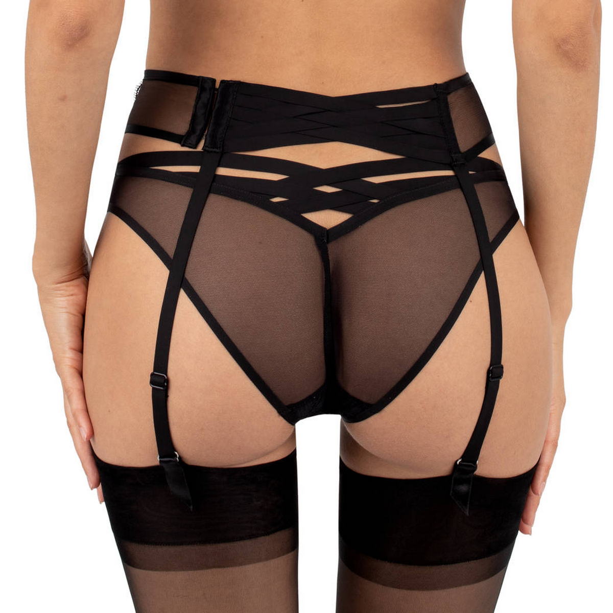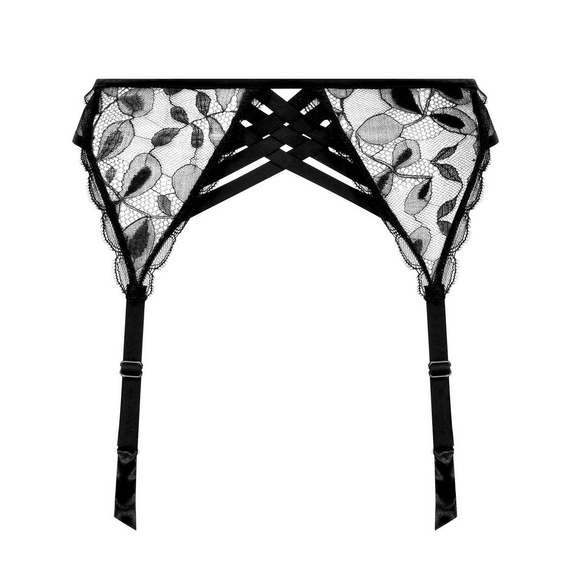 Пояс для панчіх. Передня панель виконана з мережива з рослинним орнаментом та декорована шнурівкою, бічні панелі – з тюлю, задня – у вигляді шнурівки. Регульовані підтяжки.