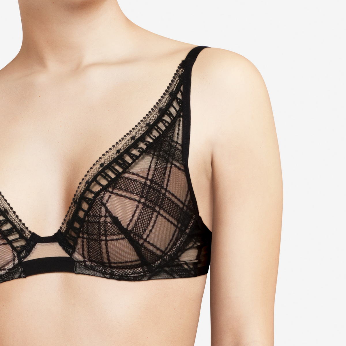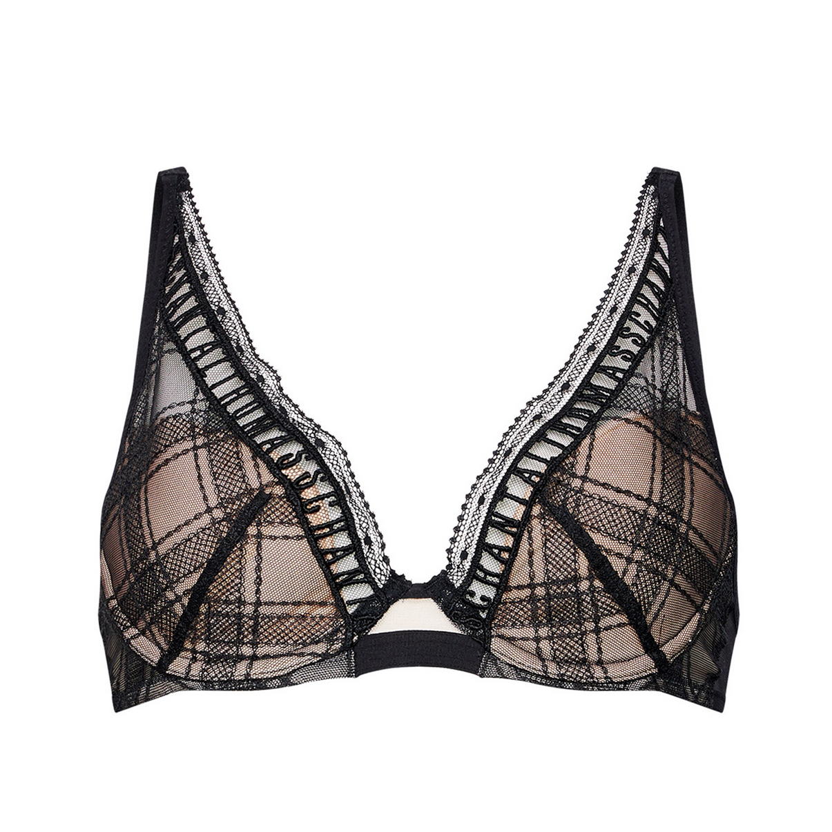 Бюстгальтер - пуш ап з ущільненою формою чашок на кісточках з глибоким V-подібним вирізом декольте. Чашки виконані з мусу і покриті прозорим тюлем, який декоровано вишивкою (квітковим орнаментом або візерунком тартан). Ділянка декольте прикрашена вишитими ініціалами "Chantal Thomass", що асоціюється з дотиком руки Майстра. Бічні панелі – з прозорого тюлю. Регульовані бретелі.