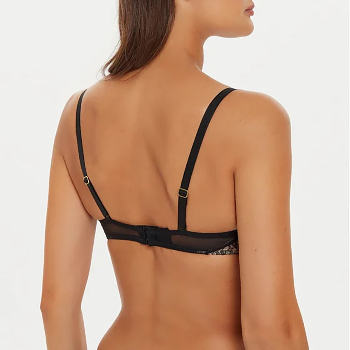 Класичний бюстгальтер з м'якою чашкою на кісточках. Виконаний із прозорого мережива з вишуканим квітковим орнаментом, яке зачаровує своїм витонченим візерунком, створюючи відчуття легкості. Передня панель прикрашена додатковим клаптем тканини, формуючи ефектний візуальний виріз. Регульовані бретелі моделі забезпечують надійну підтримку.