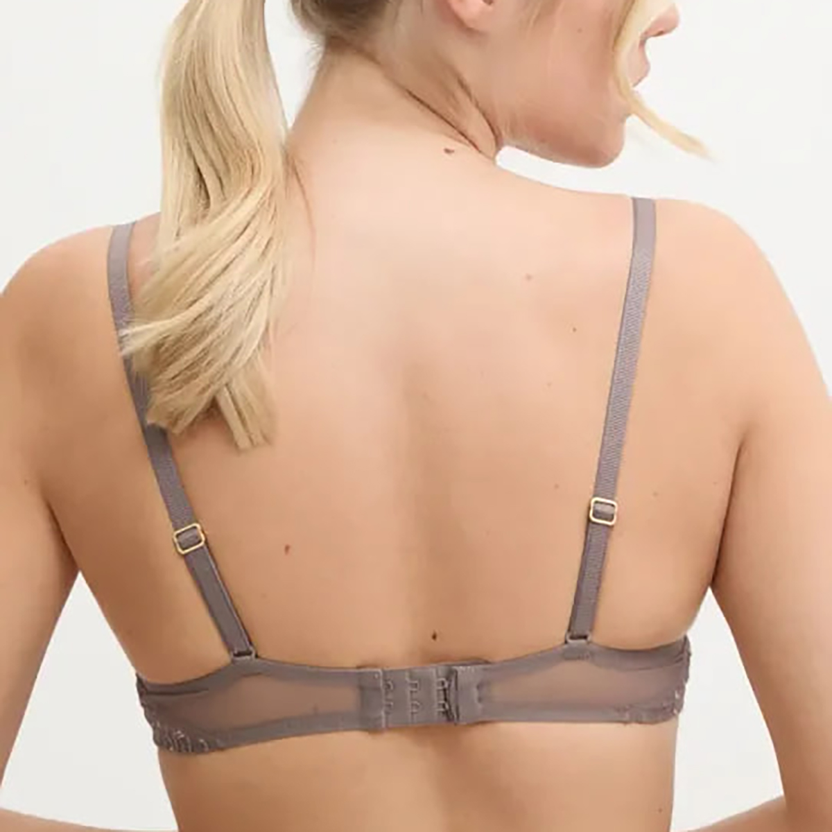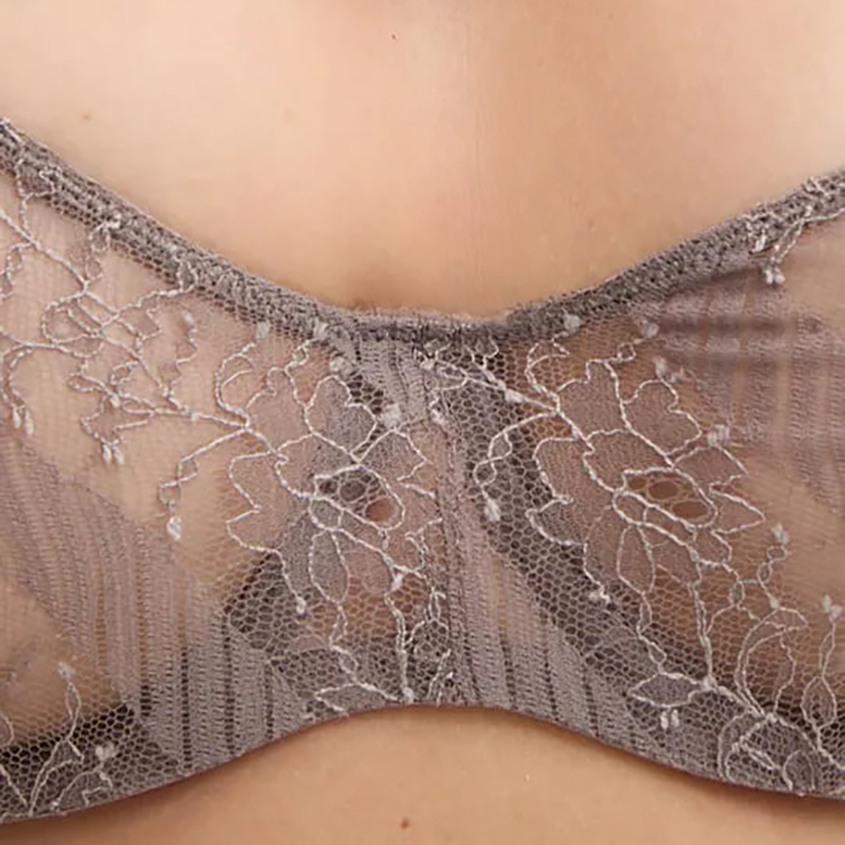 Класичний бюстгальтер з м'якою чашкою на кісточках. Виконаний із прозорого мережива з вишуканим квітковим орнаментом, яке зачаровує своїм витонченим візерунком, створюючи відчуття легкості. Передня панель прикрашена додатковим клаптем тканини, формуючи ефектний візуальний виріз. Регульовані бретелі моделі забезпечують надійну підтримку.