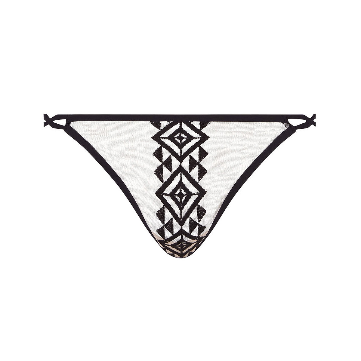 Труси - стрінги із заниженою посадкою. Передня панель виготовлена з тюлю з контрастною вишивкою, задня панель - з тюлю. Бічні панелі імітують ланки ланцюга.
