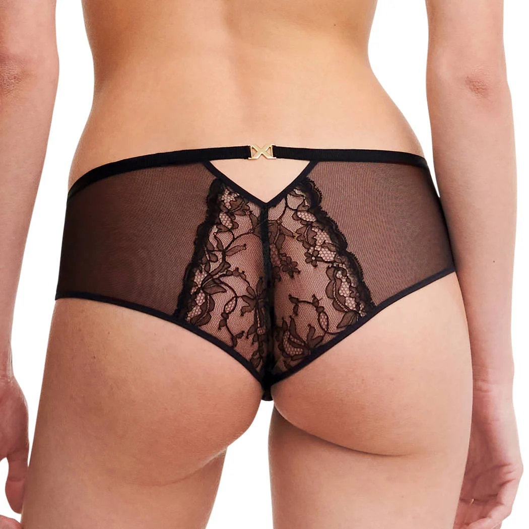 Труси – боксери із середньо-заниженою посадкою. Передня та задня панелі виконані з мережива Leavers із квітковим орнаментом; передня доповнена вставками із графічного мережива; бічні - із прозорого тюлю. Задня панель доповнена золотистою деталлю із ексклюзивним дизайном.