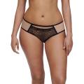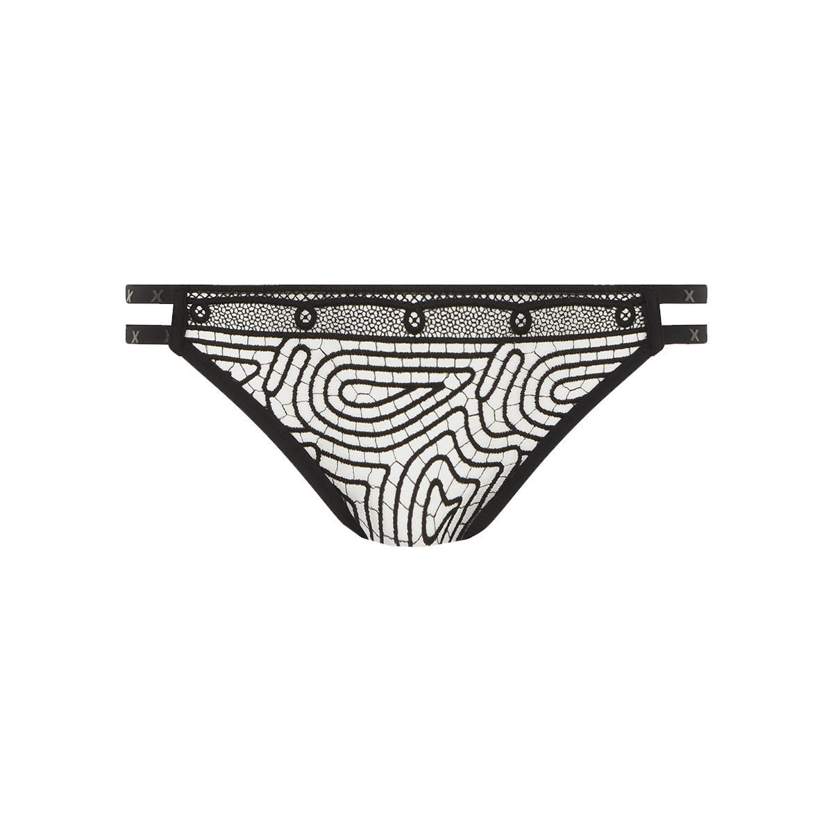Труси – стрінги із середньо – заниженою посадкою. Передня панель виконана з бежевого тюлю, який розшитий чорною контрастною вишивкою з графічним дизайном, що створює ефект тату на тілі. Бічні панелі - "спагетті", задня - виконана з бежевого тюлю та доповнена контрастним оздобленням.