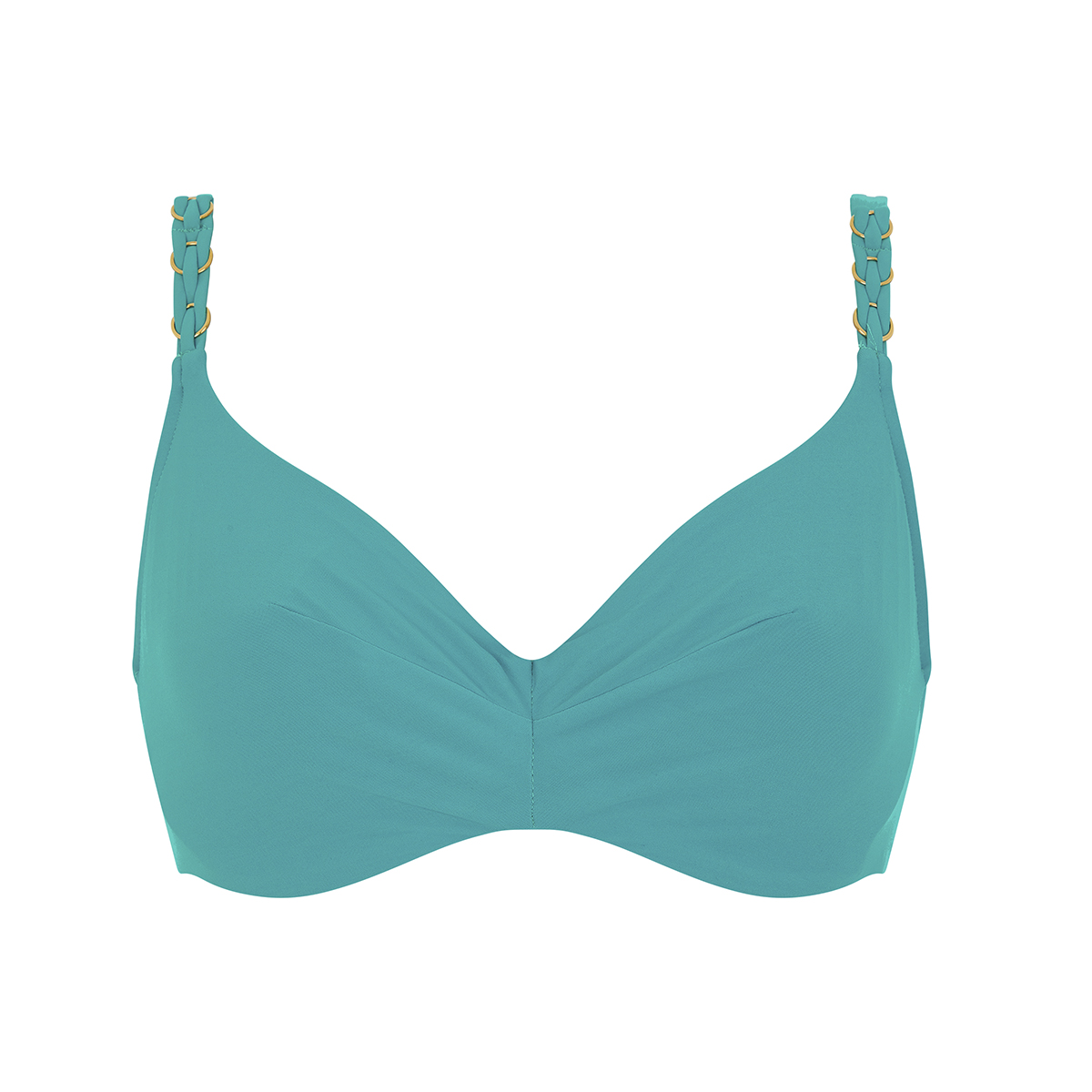 Бюстгальтер - класичний з м'якою, достатньо закритою формою чашок на кісточках. Чашки з внутрішньої сторони дубльовані тюлем для додаткової підтримки. Регулюючі бретелі доповнені декоративним плетенням та золотими кільцями. Застібка ззаду.