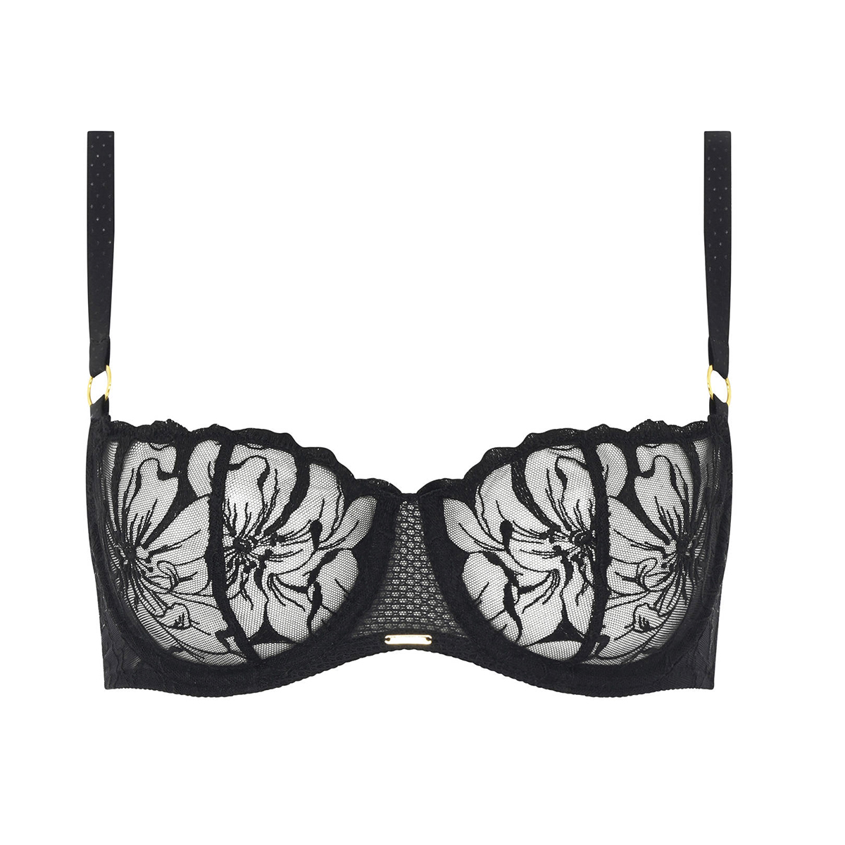 Бюстгальтер – балконет з м'якою відкритою формою чашок на кісточках. Чашки виконані з розшитого квітковим орнаментом тюлю. Основи бретелей, що регулюються, (спереду та ззаду) декоровані "золотими" кільцями. Центральна панель виконана з сітки та доповнена "золотим" аксесуаром з логотипом бренду.