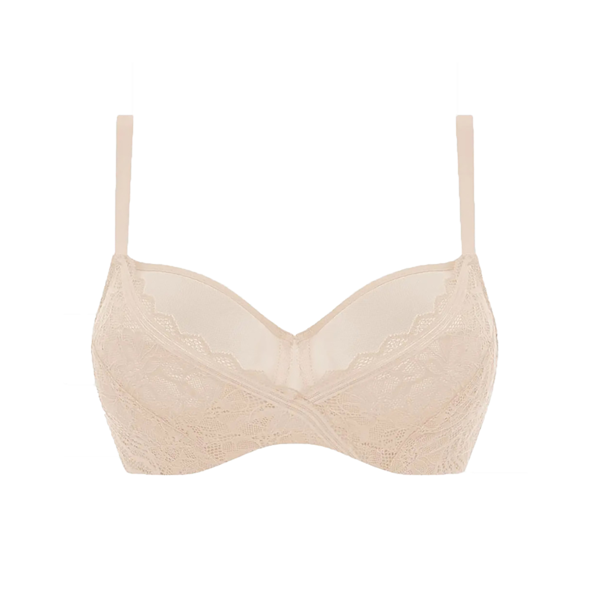 Бюстгальтер – балконет з м'якою досить відкритою формою чашок на кісточках. Чашки виконані з прозорого тюлю і покриті мереживом із квітковим орнаментом; з внутрішньої сторони дубльовані тюлем для додаткової підтримки. Бічні панелі виконані з "подвійної" мікрофібри. Балетна спинка – для збалансованого розподілу навантаження. Регульовані бретелі.