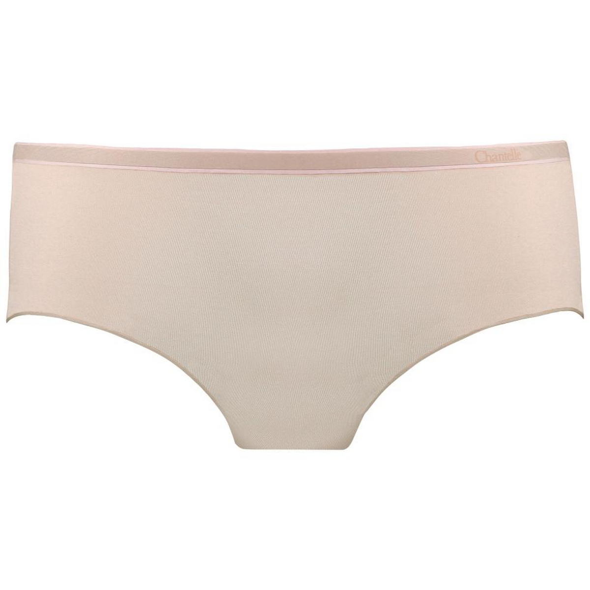 Закрита форма трусиків з високою боковиною, з невидимими краями, завдяки застосуванню технології спаювання тканин. Виконана з м'якої еластичної мікрофібри. Спереду на поясі - контрастне оздоблення, праворуч - логотип "Chantelle".