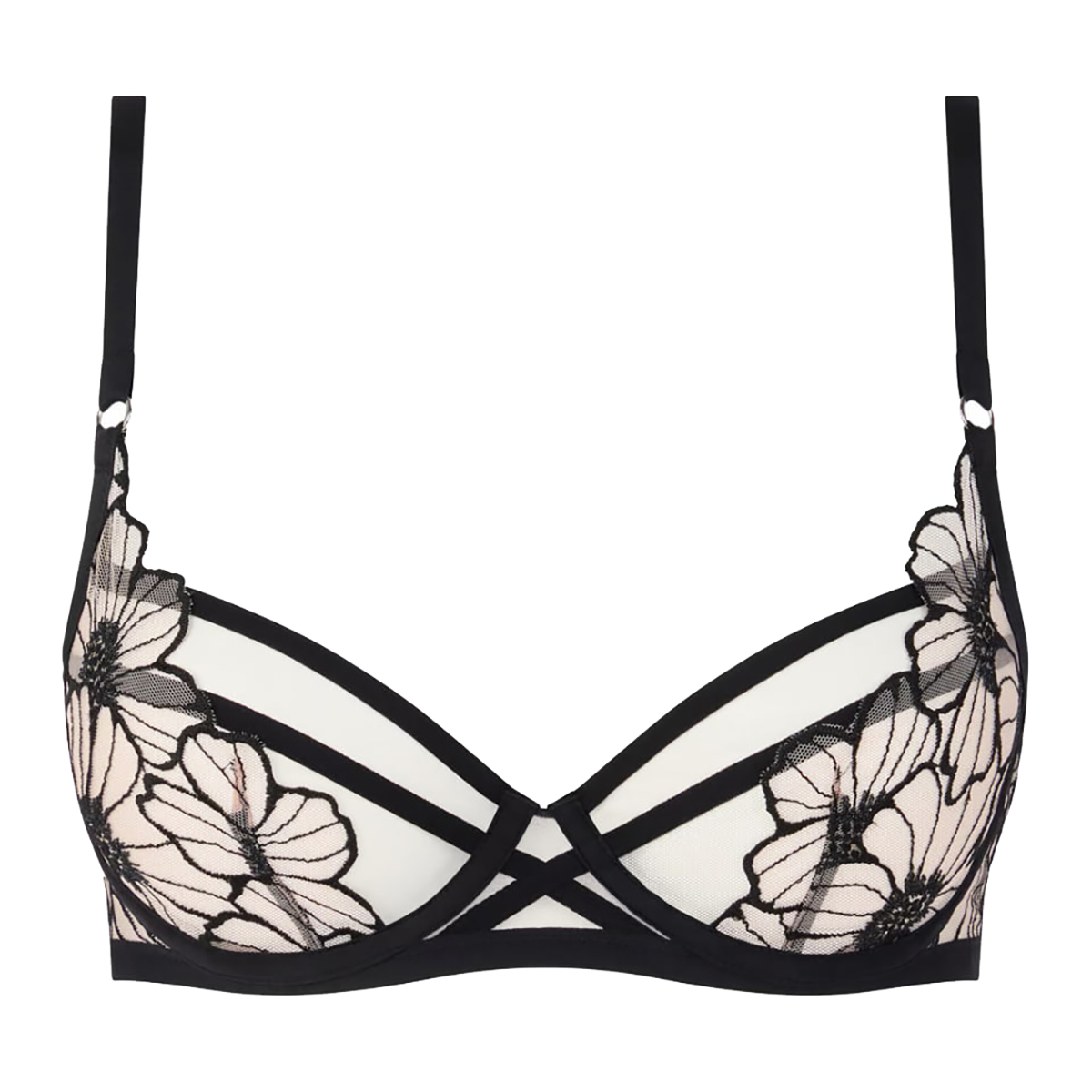 Класичний бюстгальтер на кісточках з повною чашкою надає грудям природної форми і забезпечує надійну підтримку. Виконаний із прозорого тюлю, прикрашеного виразною квітковою вишивкою у вигляді великих ромашок, він поєднує в собі витончену романтику та сучасну зухвалість. Балетна спинка м'яко розподіляє тиск і дарує комфорт протягом дня. Модель доповнена тонкими фіксованими регульованими бретелями та застібкою-гачком на задній панелі.