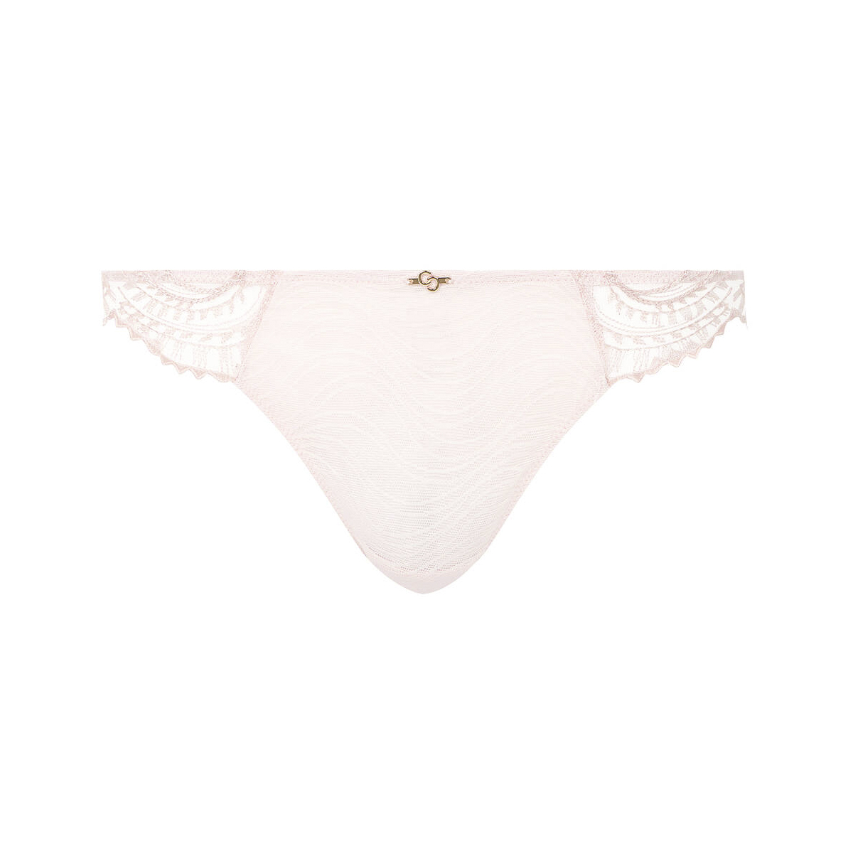 Труси - стрінги із заниженою посадкою. Практично повністю виконані із фантазійного тюлю; бічні та задня панелі доповнені вставками з розшитого люрексовою ниткою тюлю. Передня панель доповнена золотистою деталлю.
