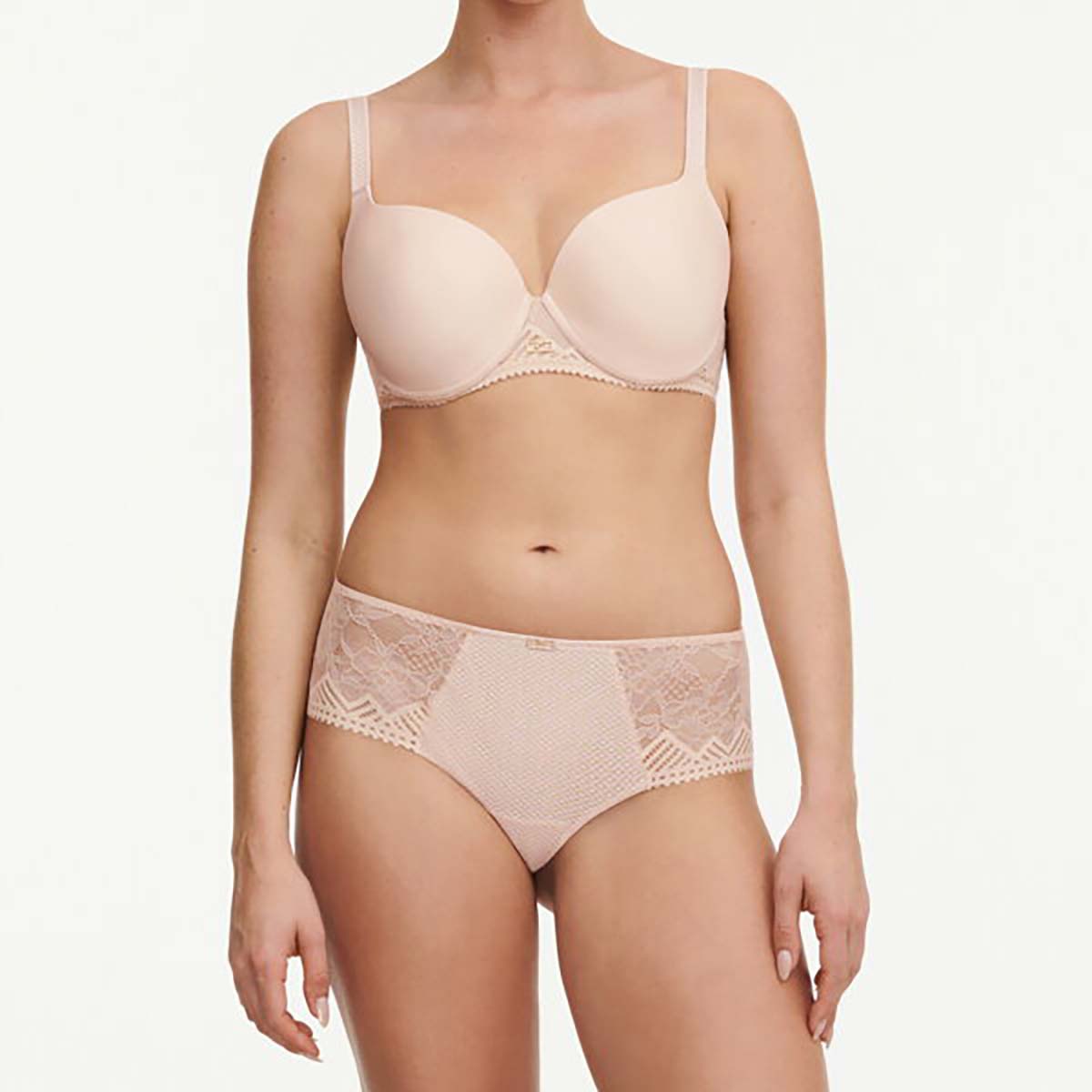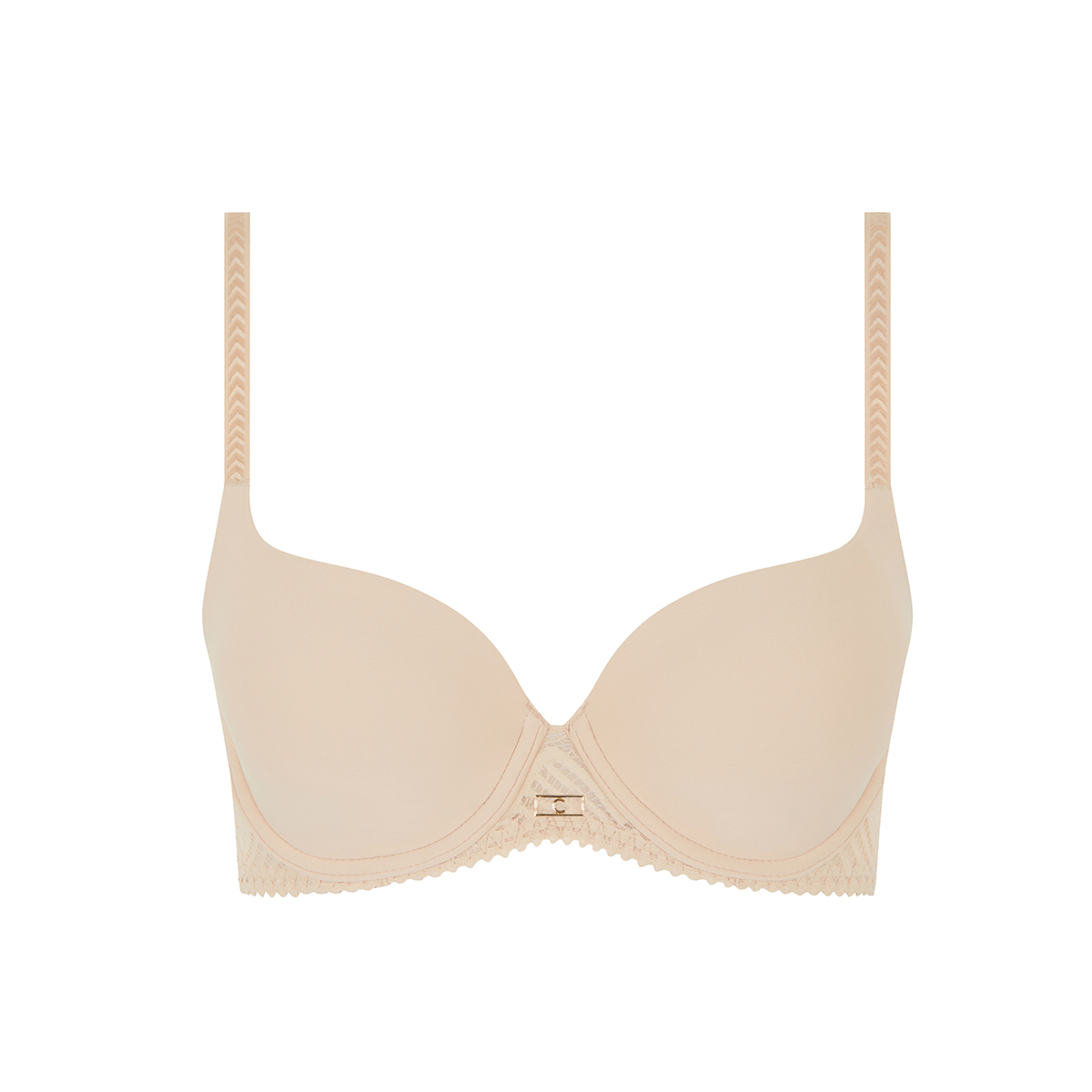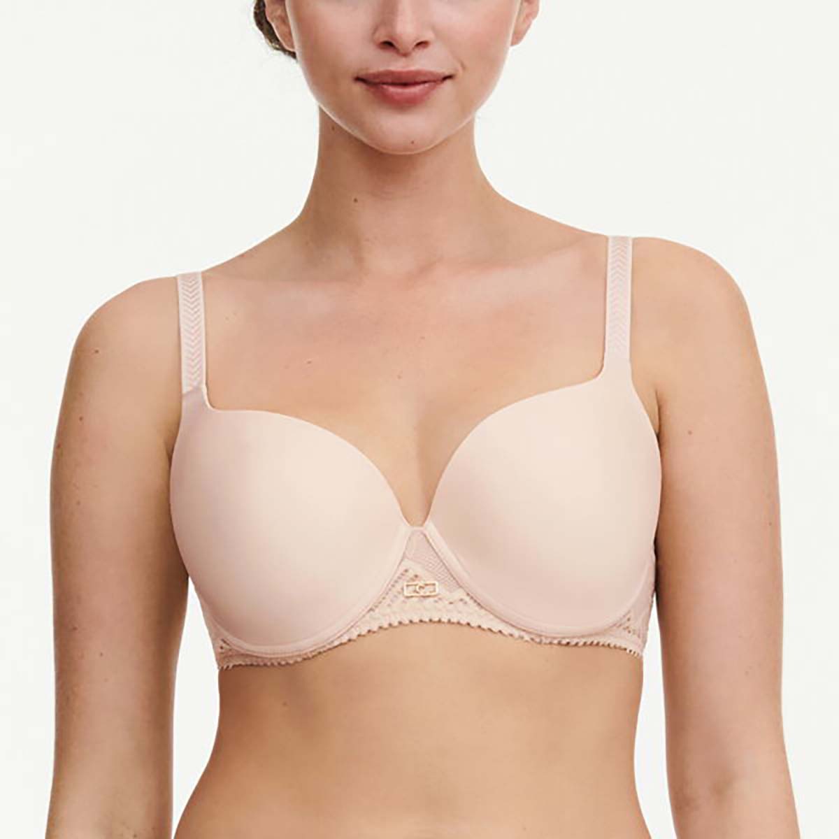 Класичний бюстгальтер на кісточках з чашкою, виконаний з м'якої мікрофібри. На передній панелі розмістилася золота прикраса у вигляді логотипу Chantelle. Пояс під грудьми, як і задня панель, декоровані мереживом із ніжним квітковим орнаментом. Модель має міцні регульовані бретелі з геометричним візерунком.