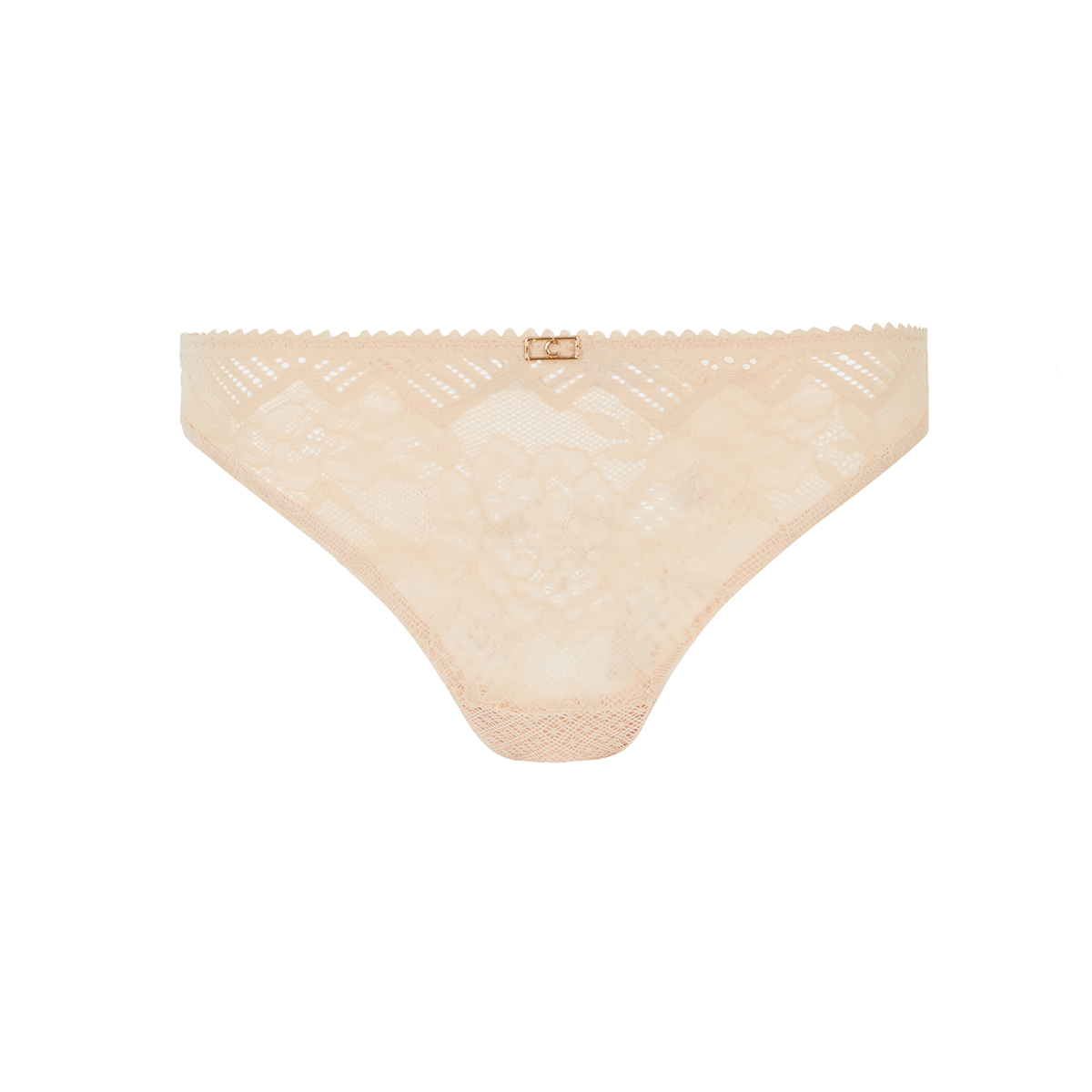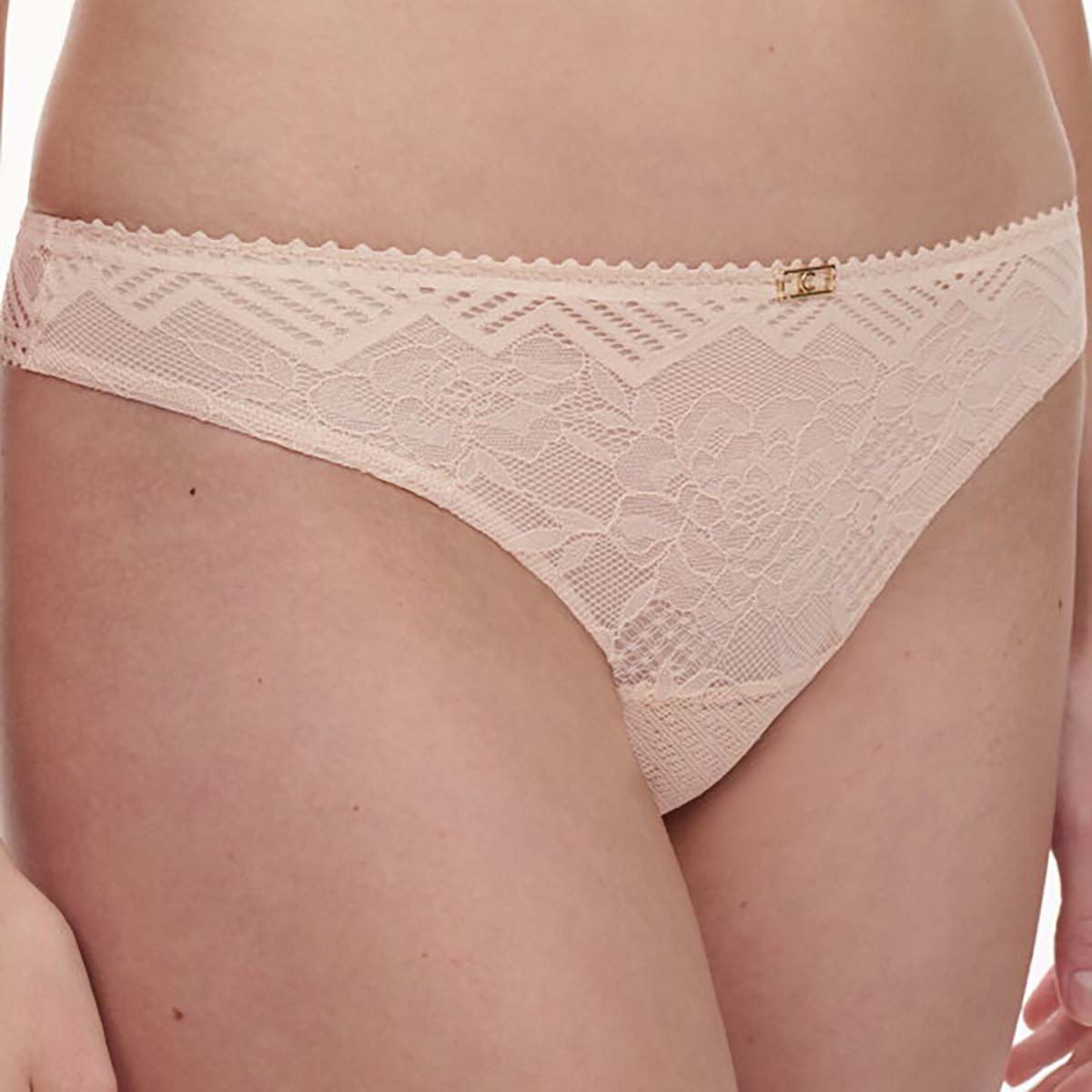 Труси-стрінги із середньо-заниженою посадкою. Передня панель виконана з непрозорої м'якої мікрофібри, доповненої мереживом із квітковим орнаментом, золотою прикрасою у вигляді логотипу Chantelle та зубчиками по верхньому краю. Задня панель повністю з мережива, із зубчиками по нижньому краю.