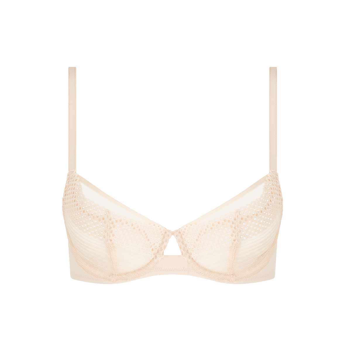 Бюстгальтер-балконет з м'якою формою чашок на кісточках, виготовлений з м'якої мікрофібри. Чашки покриті мереживом та сіткою, доповнені вставками з тюлю. Еластичні бретелі регулюються для зручнішої посадки.