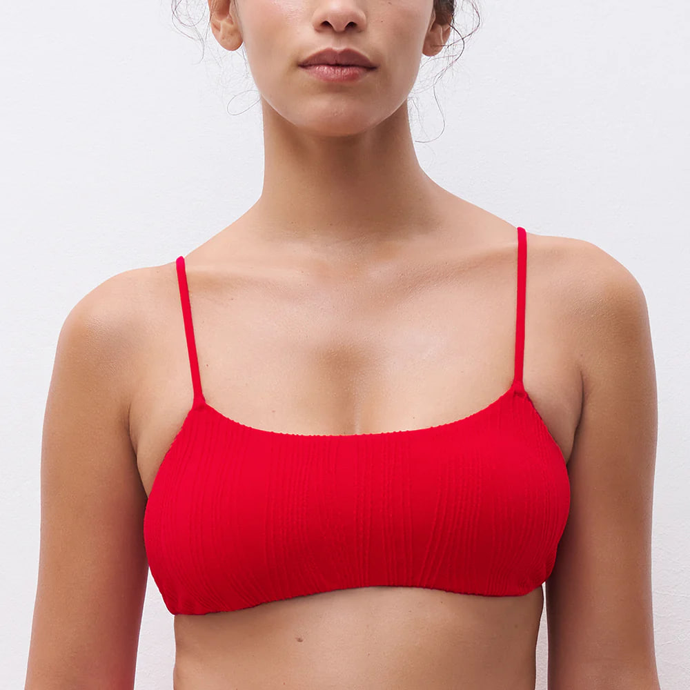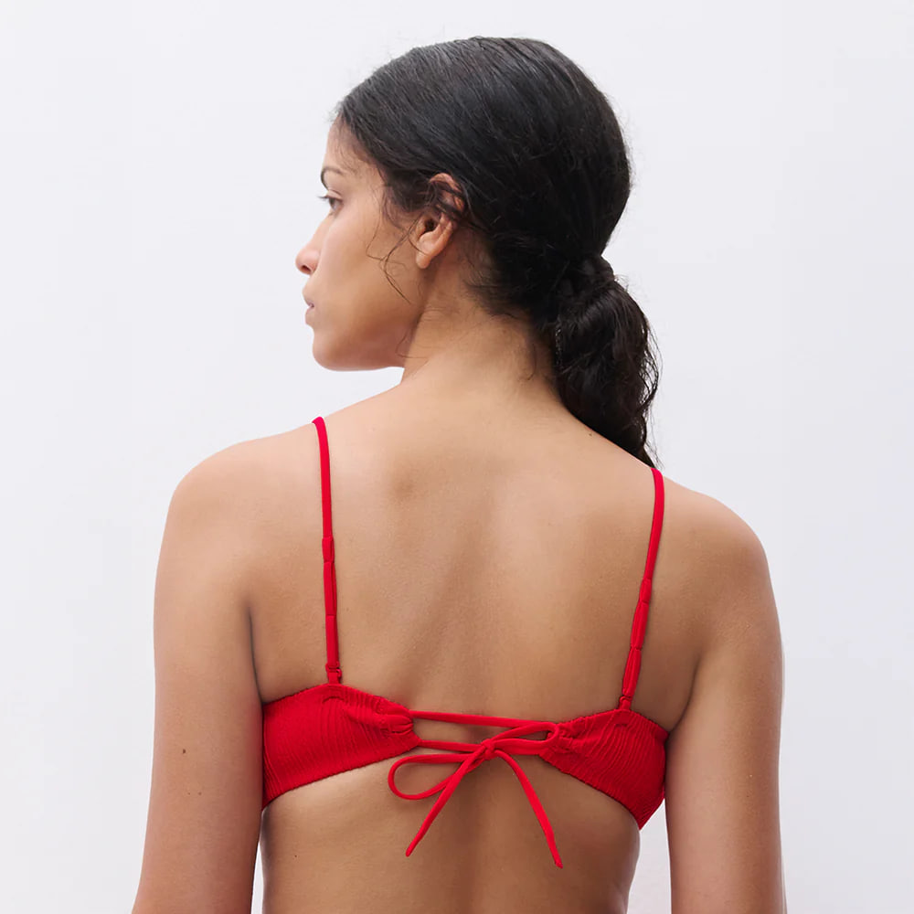 Бюстгальтер - топ із м'якою формою чашок без кісточок. Повністю дубльований. Виконаний із матеріалу з ексклюзивною текстурою. На зав'язках на спині. Регульовані бретелі (за допомогою петель).
