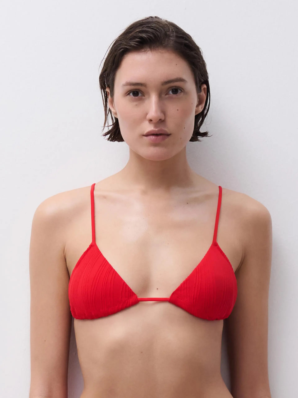 Бюстгальтер з м'якими трикутними чашками без кісточок та з подушечками, що знімаються, забезпечує комфорт та природну форму грудей. Виконаний з італійської супереластичної тканини, що ідеально підходить для всіх типів фігури. Модель з глибоким V-подібним вирізом на передній панелі та тонкими еластичними бретелями, які зав'язуються на спинці.