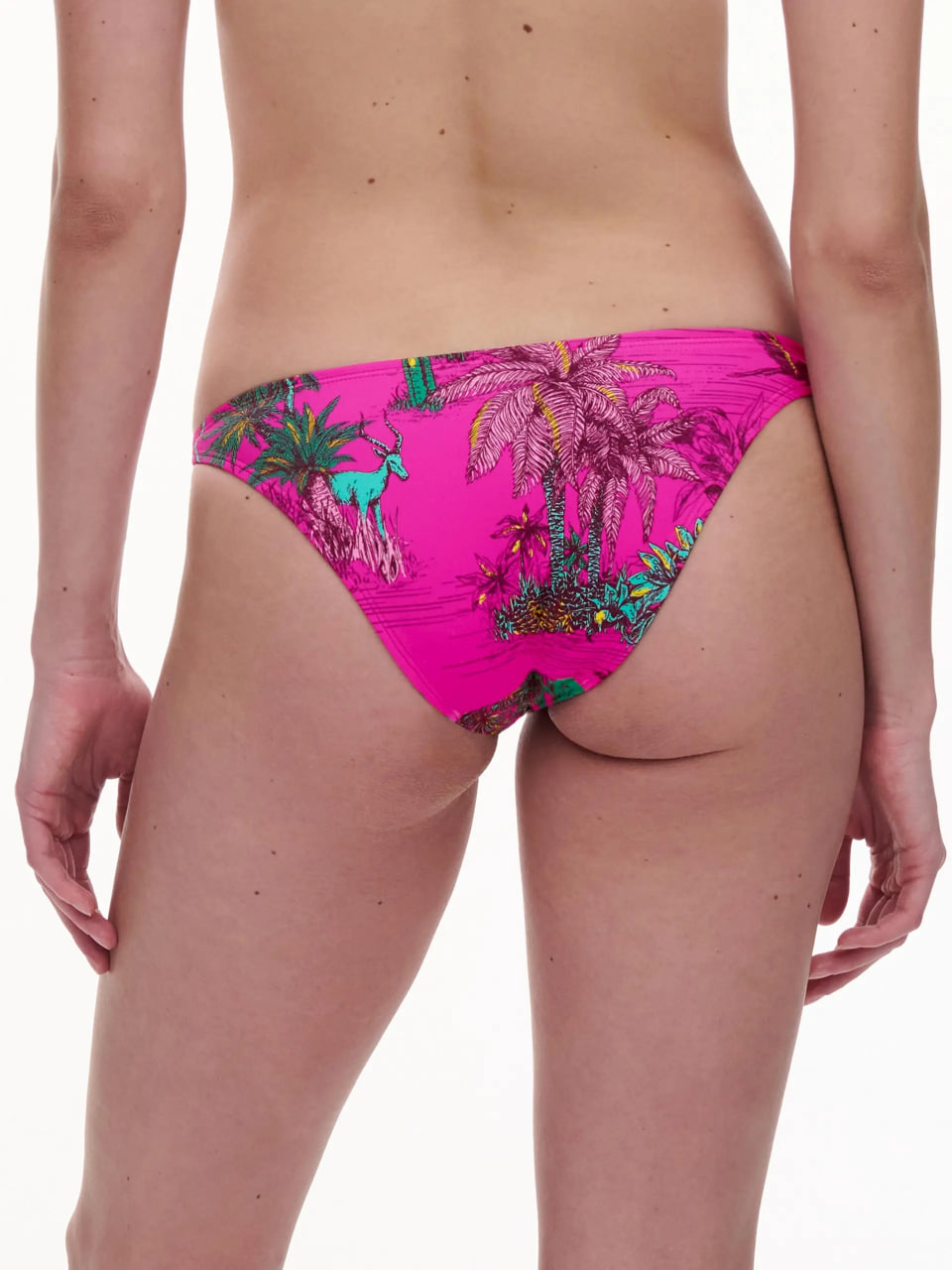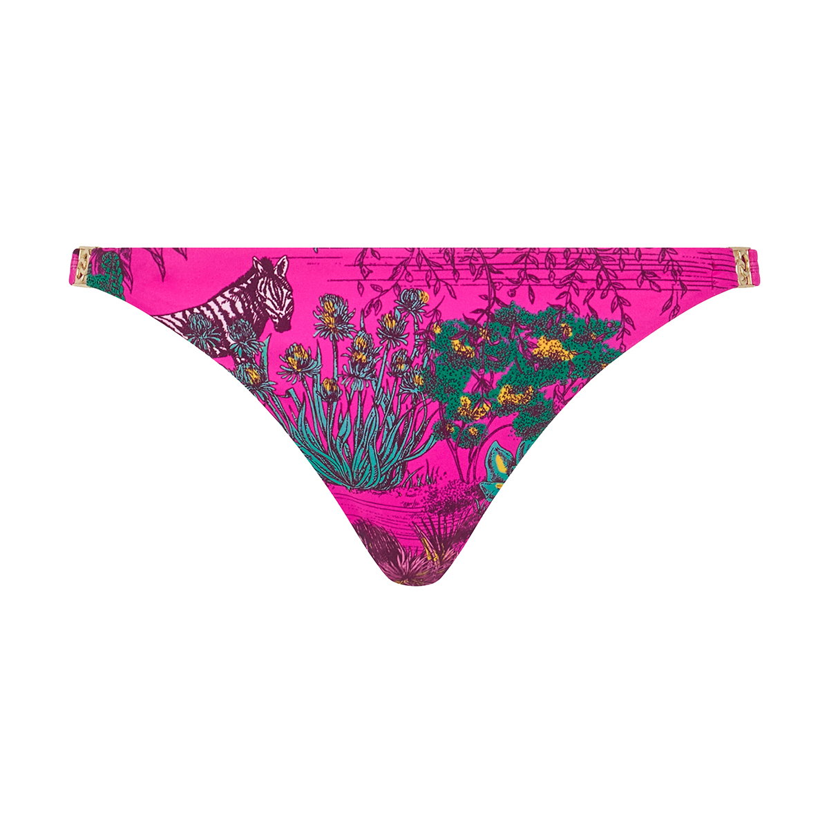 Труси-бікіні із середньо-заниженою посадкою, виконані з еластичної італійської тканини з виразним принтом, що підкреслює зухвалий та яскравий характер моделі. Еластичний пояс забезпечує комфортну посадку, а бічні панелі прикрашені витонченими позолоченими елементами, що додають образу витонченості.