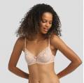 Бюстгальтер із формованою злегка ущільненою формою чашки. Чашки бюстгальтера покриті плоским мереживом з квітковим орнаментом. Плісеровані бретелі регулюються. Область декольте доповнена декоративними зубчиками.