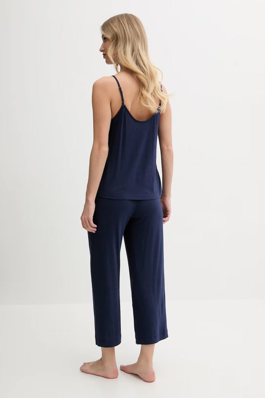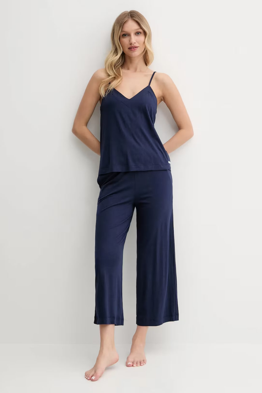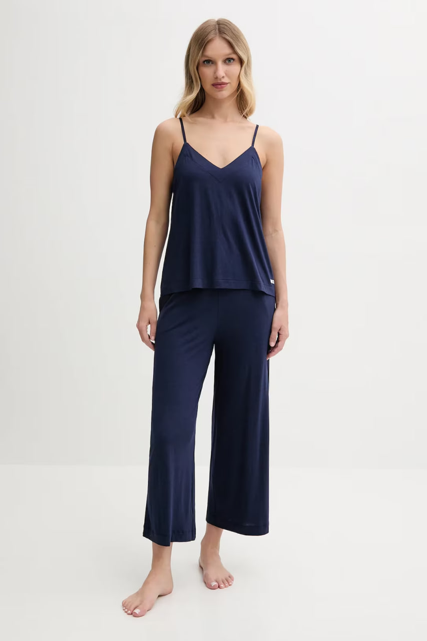 Піжама вільного крою: майка + штани. Модель виготовлена з тонкого, еластичного трикотажу. Майка з V-подібним вирізом витончено підкреслює лінію декольте, а тонкі регульовані фіксовані бретелі надають образу легкості. Широкі укорочені штани з поясом на резинці не сковують рухів, а накладні бічні кишені додають практичності.