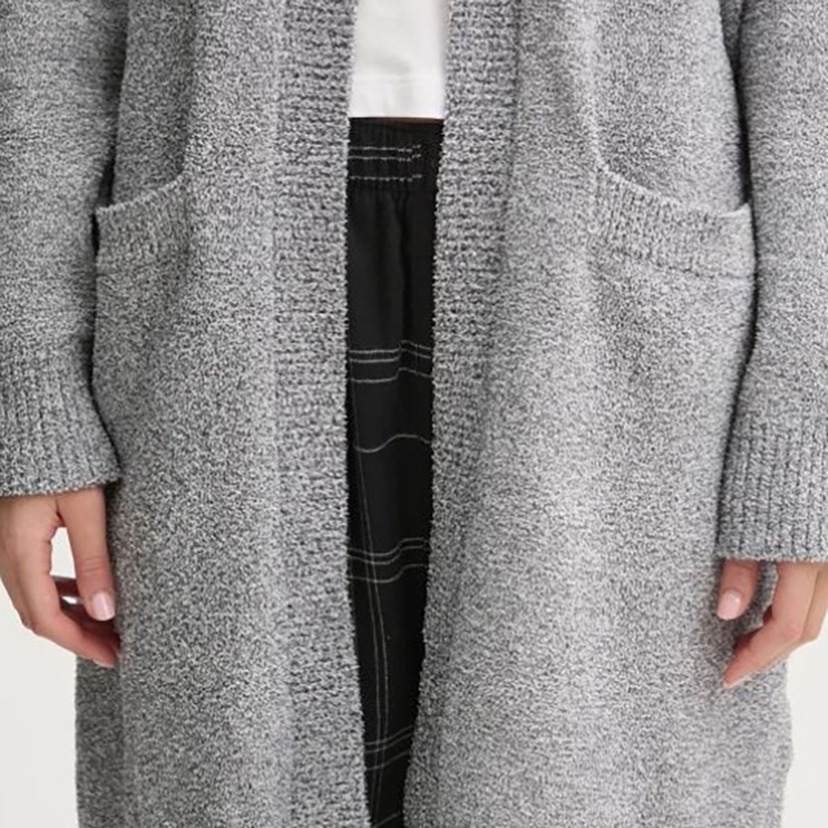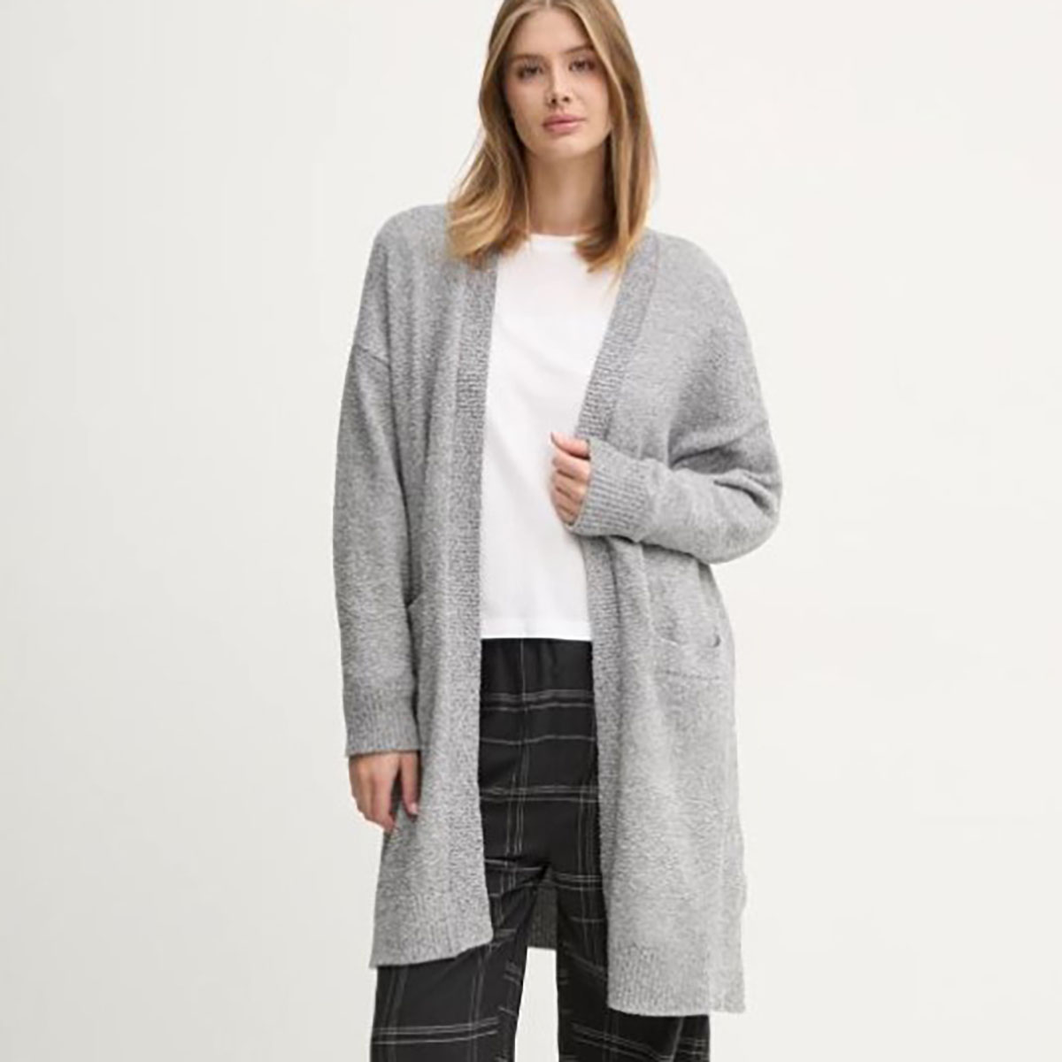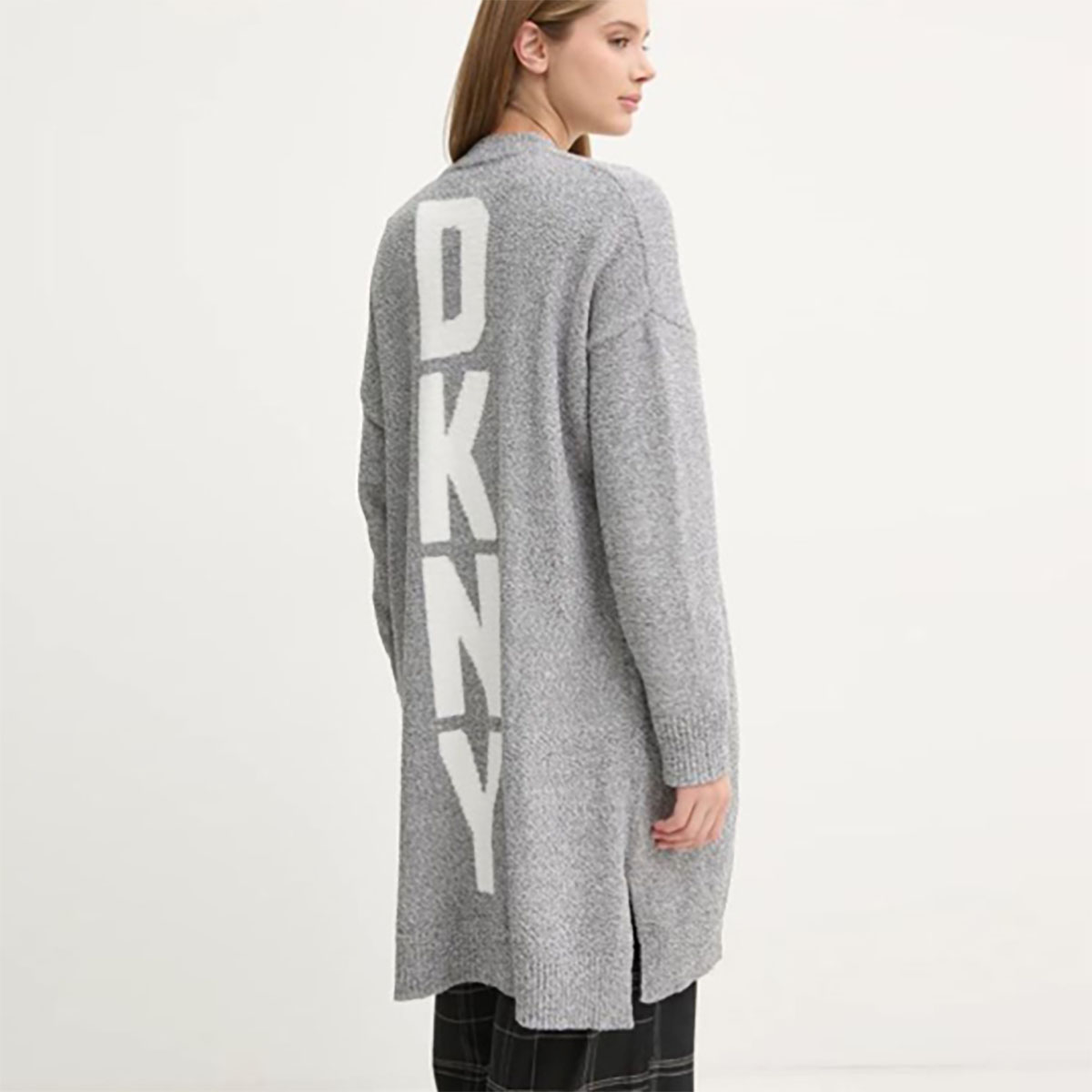Подовжений теплий кардиган вільного крою, виконаний з м'якого та приємного на дотик тонкого трикотажу. Поліестер гарантує підвищену стійкість до заломів. Прикрашений контрастним принтом із логотипом DKNY. Модель доповнена двома накладними глибокими бічними кишенями для максимальної зручності.