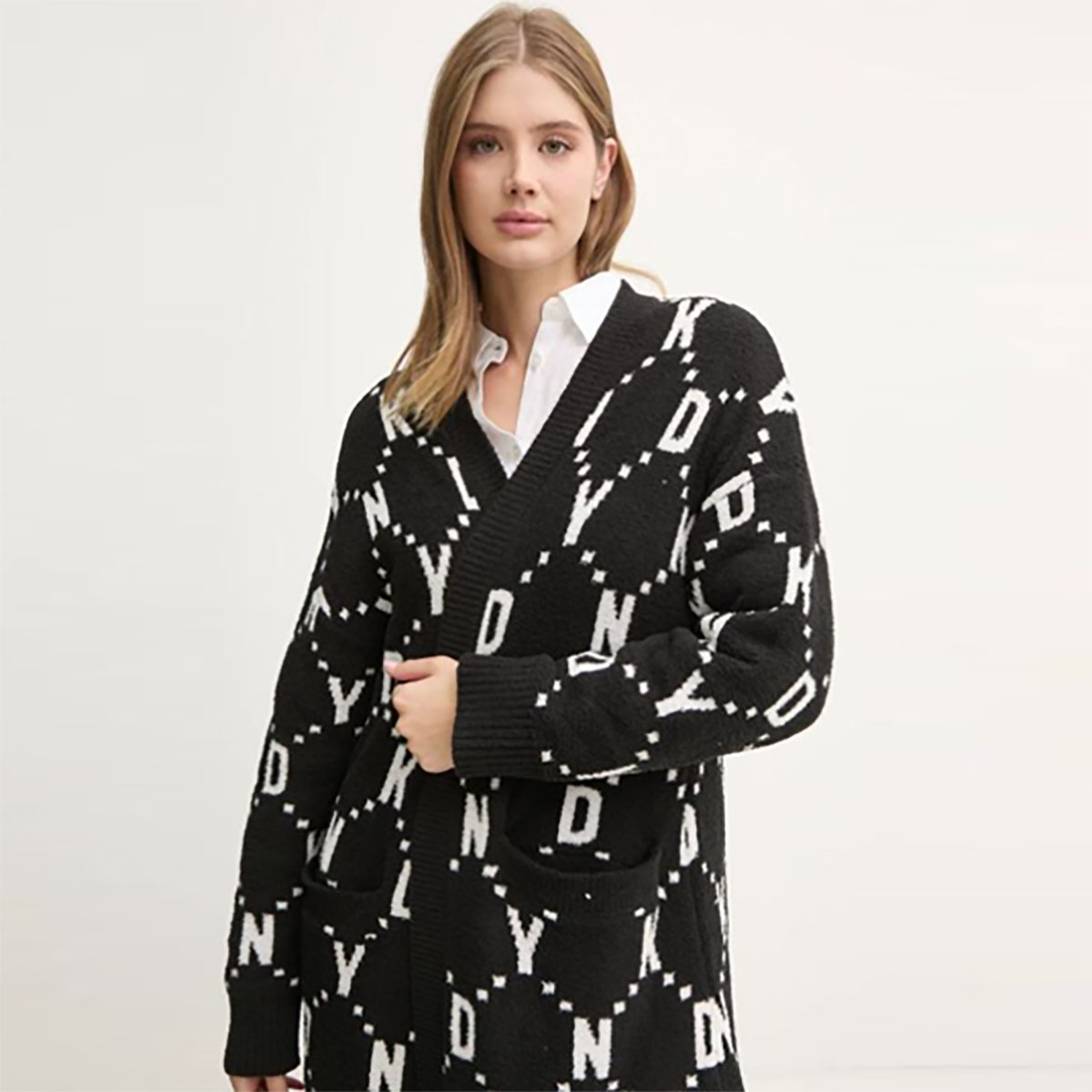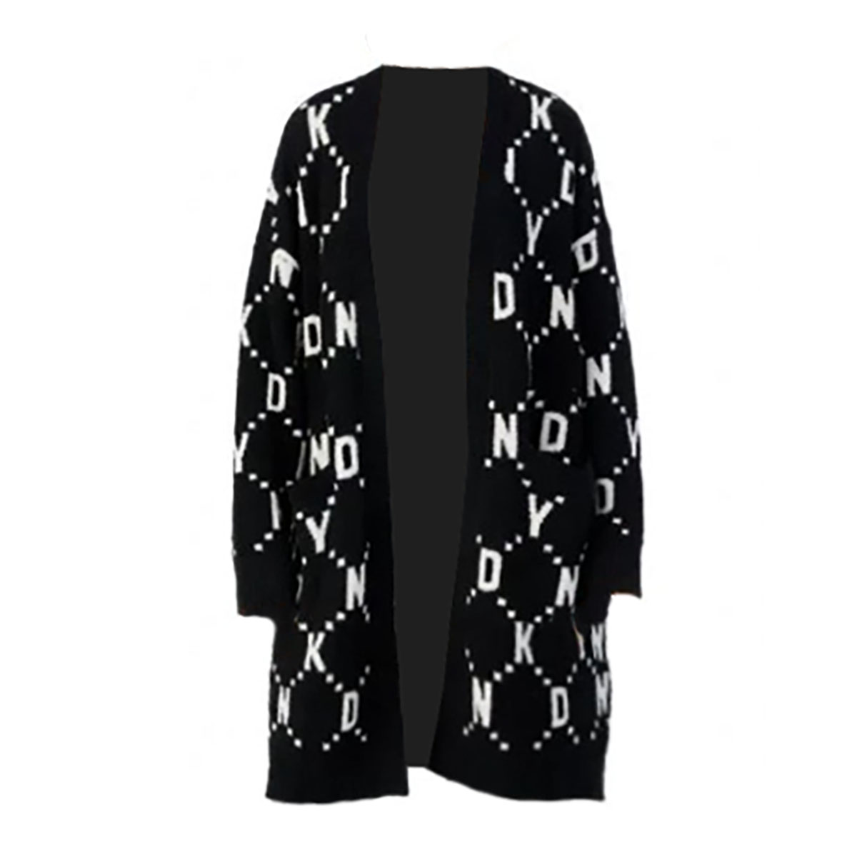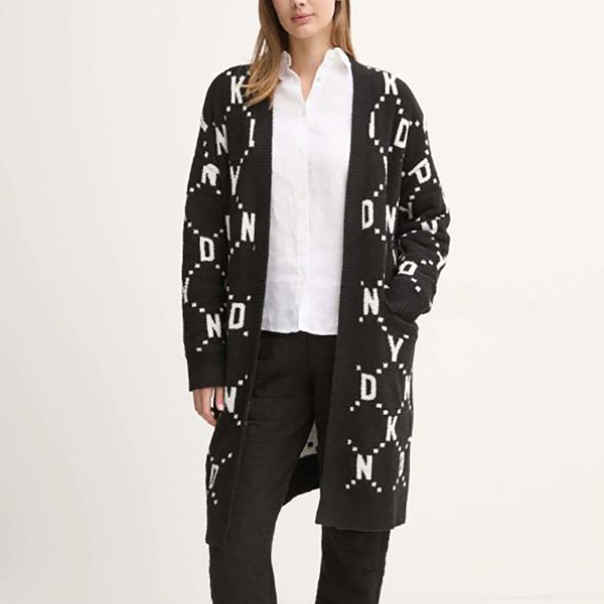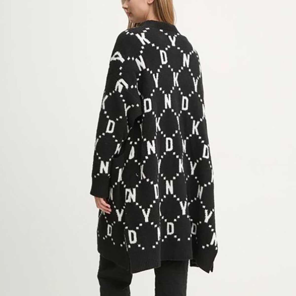 Подовжений теплий кардиган вільного крою, виконаний з м'якого та приємного на дотик тонкого трикотажу. Поліестер гарантує підвищену стійкість до заломів. Прикрашений контрастним принтом із логотипом DKNY. Модель доповнена двома накладними глибокими бічними кишенями для максимальної зручності.