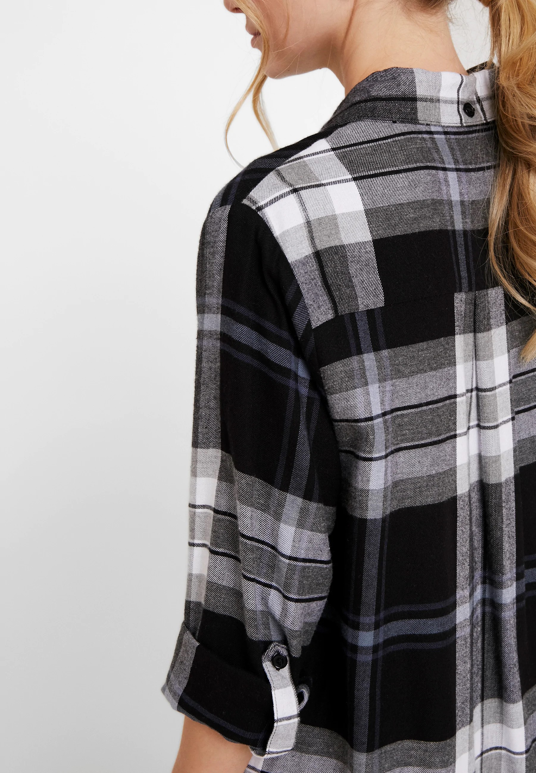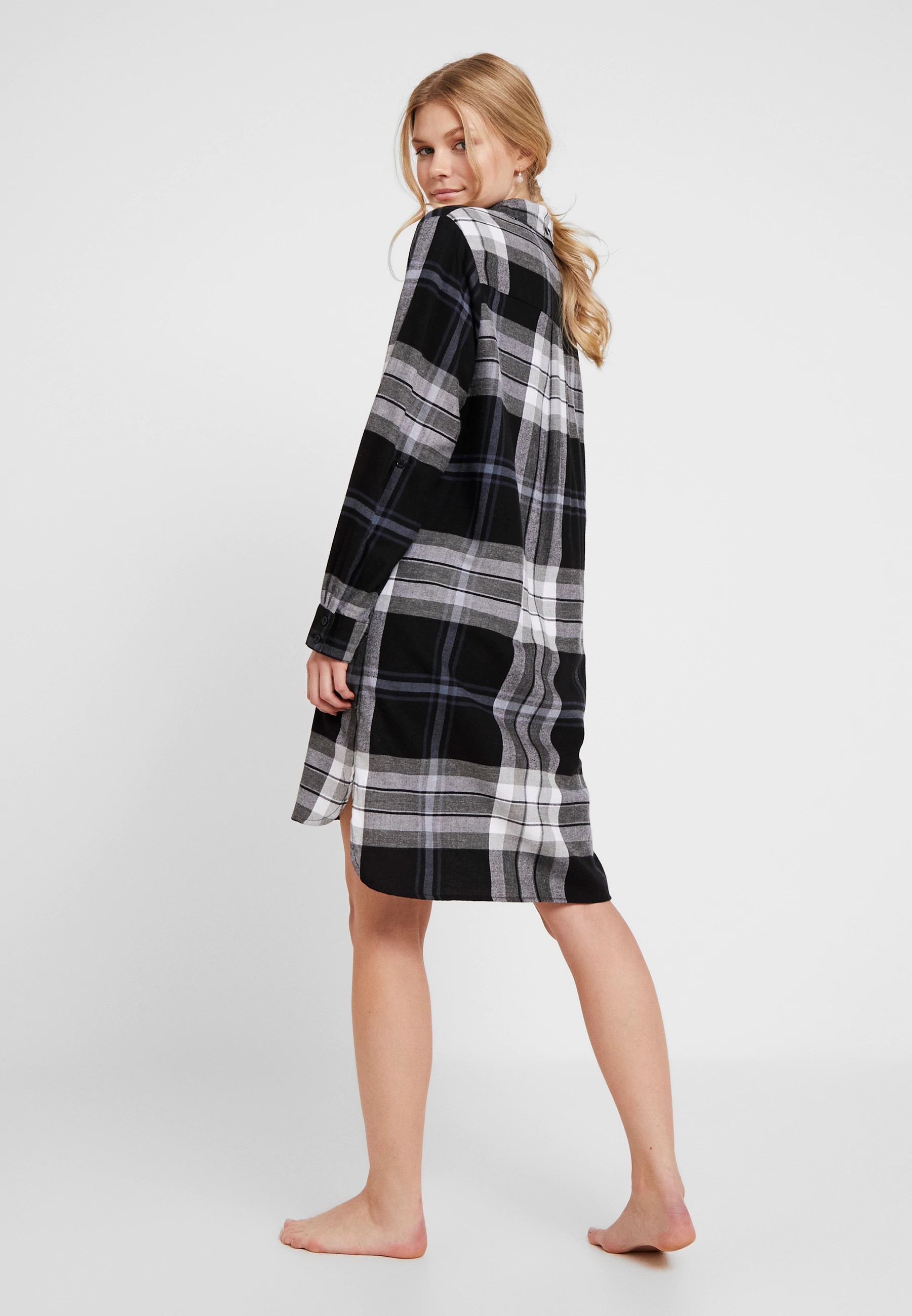 Подовжена сорочка для сну або для дому виготовлена в чоловічому стилі, на ґудзиках, з бічними кишенями, з коміром та нагрудною кишенею. З боків розрізи. Задня панель – трохи подовжена.