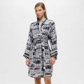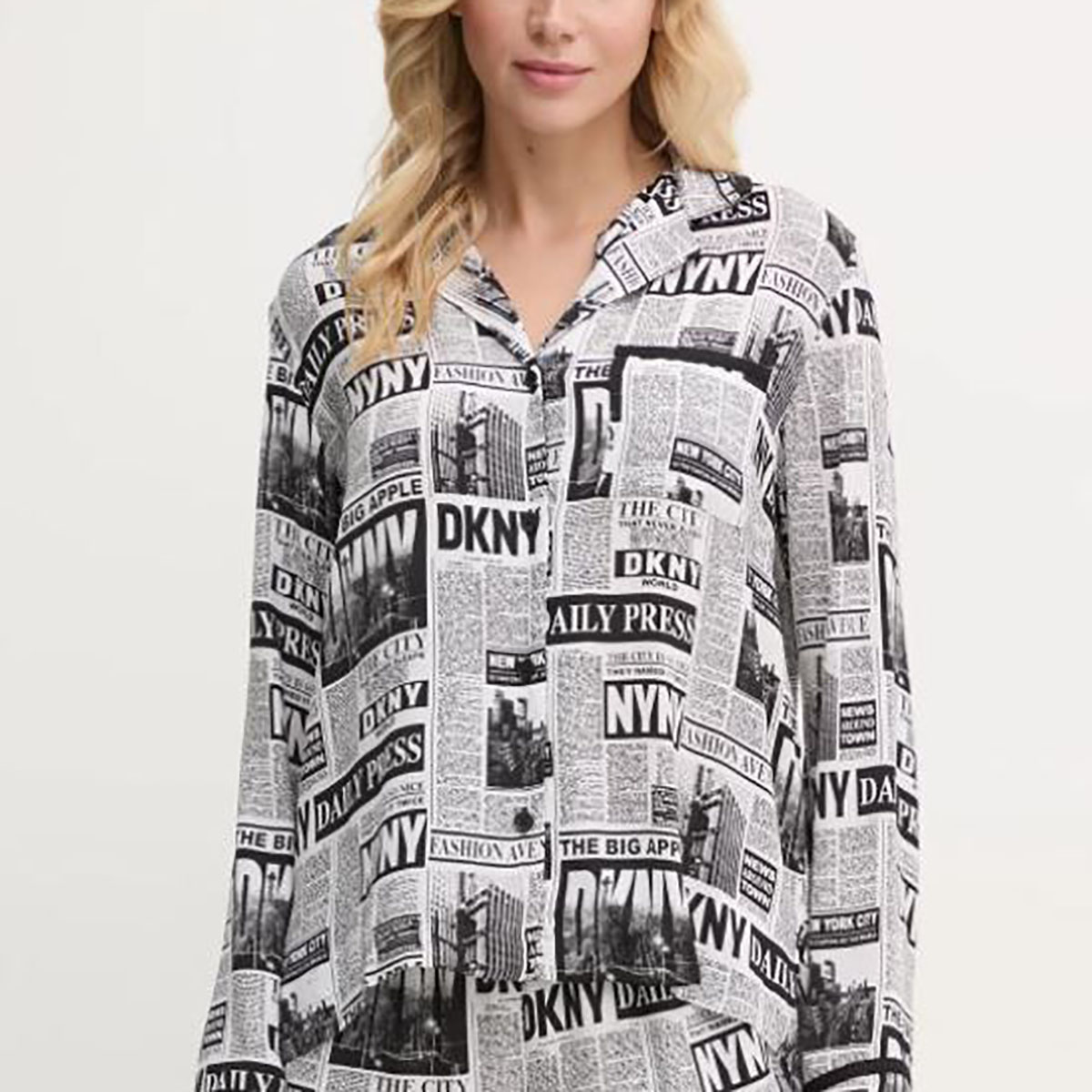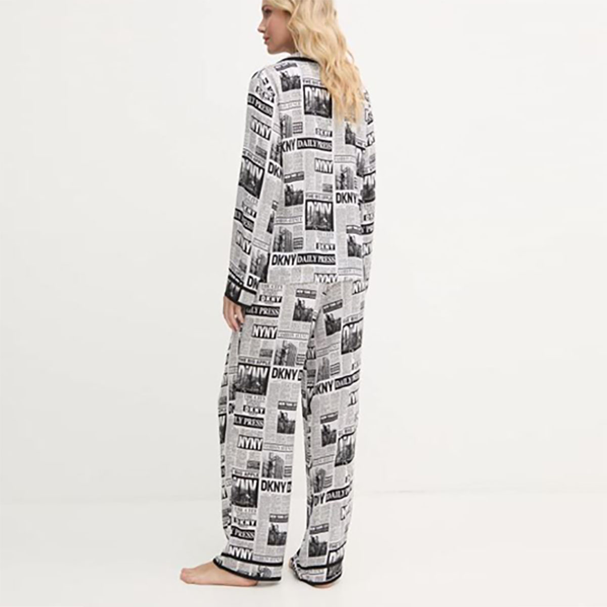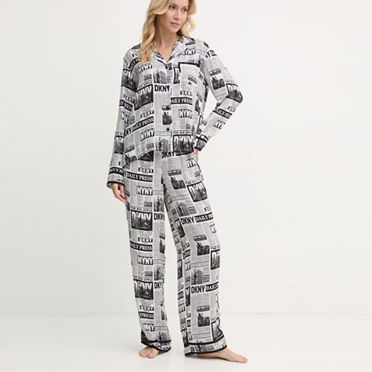 Класична піжама складається з сорочки та штанів. Модель виконана з тонкої нееластичної тканини, яка гарантує підвищену стійкість до заломів. Прикрашена контрастним набивним малюнком у вигляді логотипу DKNY. Сорочка на ґудзиках, доповнена акуратним коміром та нагрудною кишенею. Штани з високою посадкою мають дві накладні бічні кишені для більшої функціональності, а також еластичний пояс, який фіксує посадку по фігурі.