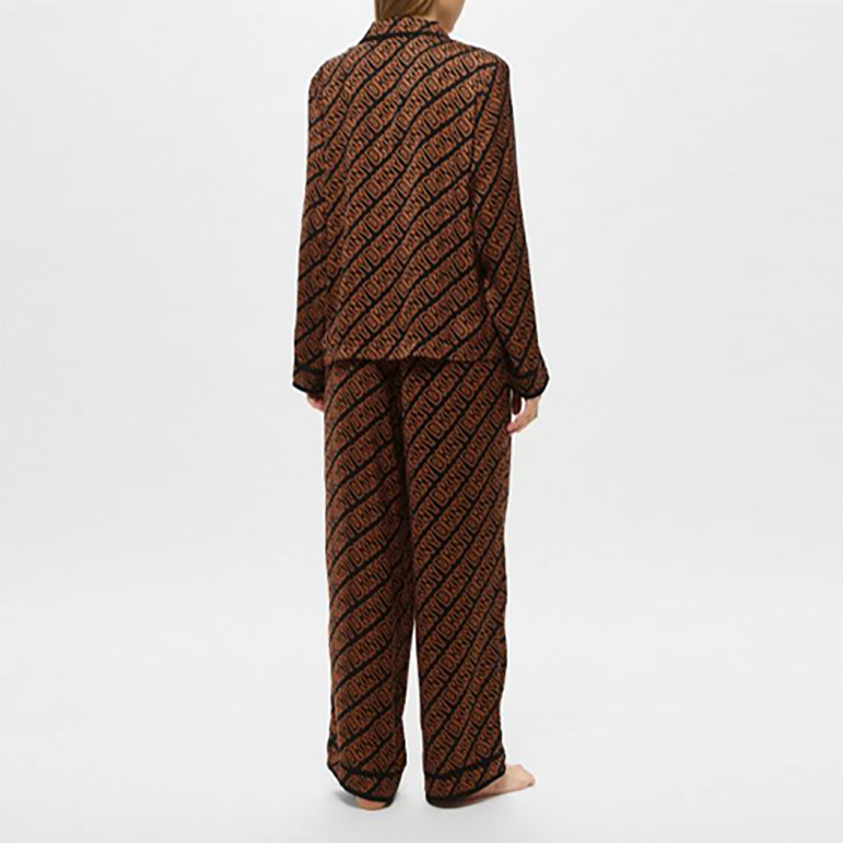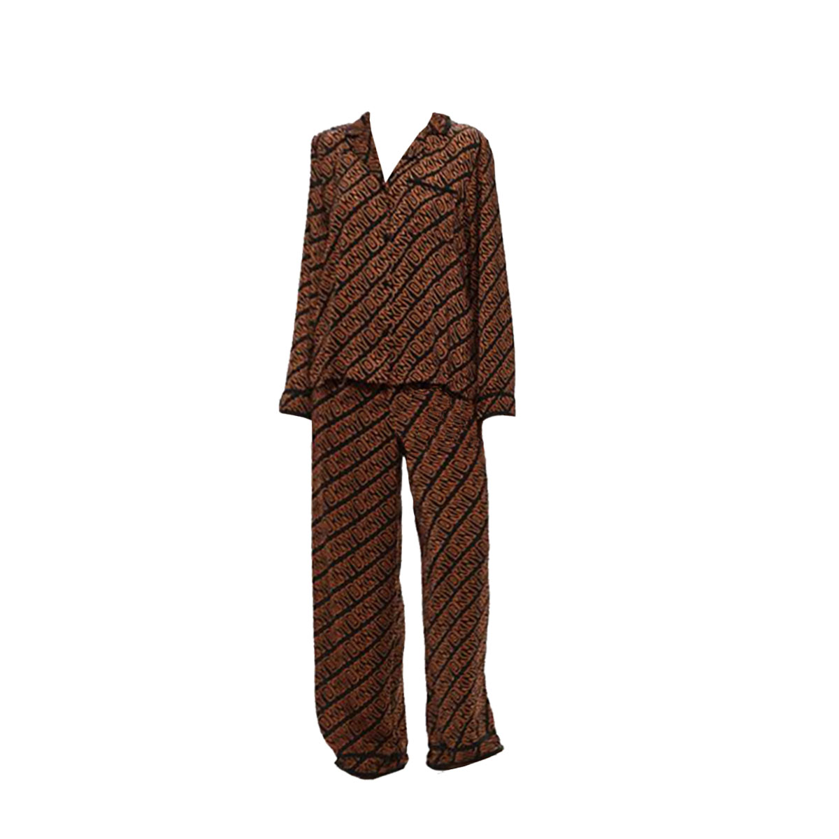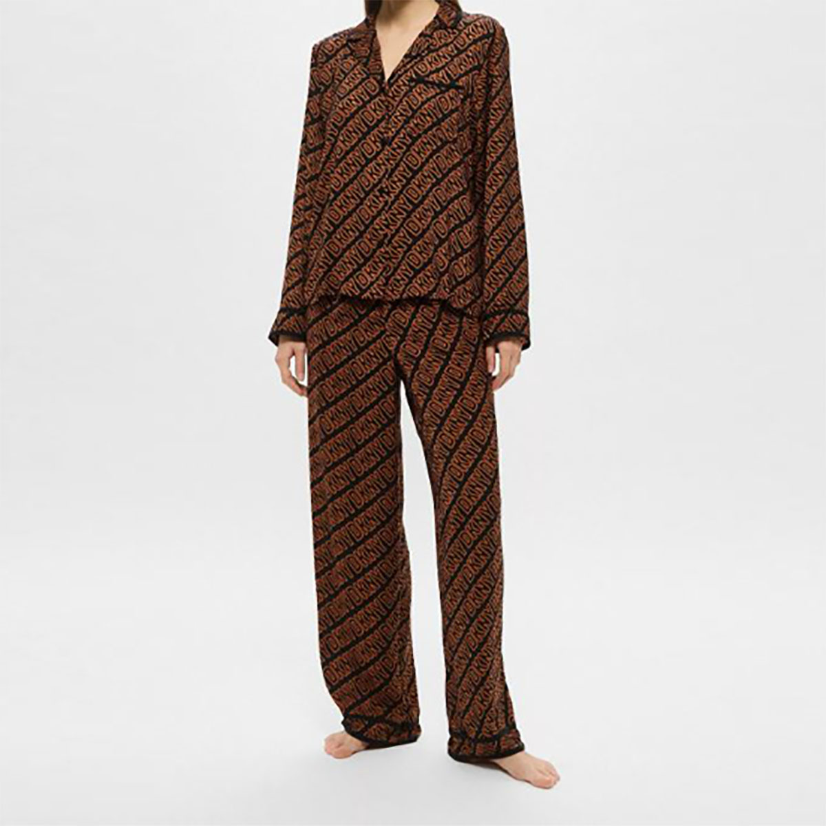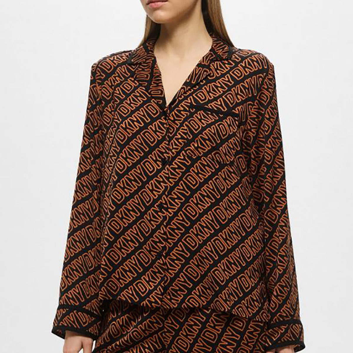 Класична піжама складається з сорочки та штанів. Модель виконана з тонкої нееластичної тканини, яка гарантує підвищену стійкість до заломів. Прикрашена контрастним набивним малюнком у вигляді логотипу DKNY. Сорочка на ґудзиках, доповнена акуратним коміром та нагрудною кишенею. Штани з високою посадкою мають дві накладні бічні кишені для більшої функціональності, а також еластичний пояс, який фіксує посадку по фігурі.